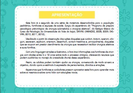 Com uma linguagem simples e ilustrativa, este livro apresenta informações aos familiares de crianças com idades entre 5 e 12 anos sobre todo o processo cirúrgico, oferecendo recursos que podem auxiliá-los no manejo da ansiedade diante dessa experiência. Assim, os adultos podem ajudar as crianças, conversando de modo sincero e objetivo, dando apoio e estímulo à expressão de pensamentos, dúvidas e emoções.rnrnrnCONHEÇA AS AUTORASrnrnMarina MenezesrnProfessora Adjunto A – Dedicação Exclusiva no Departamento de Psicologia da – UFSC. Atualmente atua como docente da Residência Multidisciplinar de Alta Complexidade do Hospital Universitario da UFSC. Possui Graduação em Psicologia – UFPR , Mestrado em Psicologia (Área de Concentração: Psicologia e Sociedade) – UFSC e Doutorado em Psicologia (Área de Concentração: Processos Psicossociais, Saúde e Desenvolvimento Psicológico) – Programa de Pós-Graduação em Psicologia da UFSC. Realizou Estágio de Doutorando – PDEE com bolsa CAPES na Faculdade de Psicologia da Universidade de Lisboa – Portugal nas áreas de Psicologia da Saúde e Psicologia Pediátrica. É Especialista em Psicologia Clínica – Conselho Federal de Psicologia – CFP.rnrnJosiane DelvanrnPossui graduação em Psicologia pela Universidade do Vale do Itajaí (1992), graduação em Pedagogia pela Universidade do Vale do Itajaí (1990), mestrado em Psicologia pela Pontifícia Universidade Católica do Rio Grande do Sul (2000) e doutorado em Psicologia pela Universidade de São Paulo (2007). Atualmente é coordenadora do curso de Psicologia da Universidade do Vale do Itajaí e professora na disciplina de Psicologia do Desenvolvimento Humano, Orientadora de Estágio Curricular Obrigatório e de Trabalho de Iniciação Científica. Tem experiência na área de Psicologia em Desenvolvimento de crianças, atuando principalmente nos seguintes temas: crianças, parentalidade e saúde mental na infância.rnrnDADOS TÉCNICOSrnrnISBN: 978-85-9501-033-8rnFormato: 23 x 16cm | 32 Páginas | Peso: 112grnAcabamento: Capa grampeada