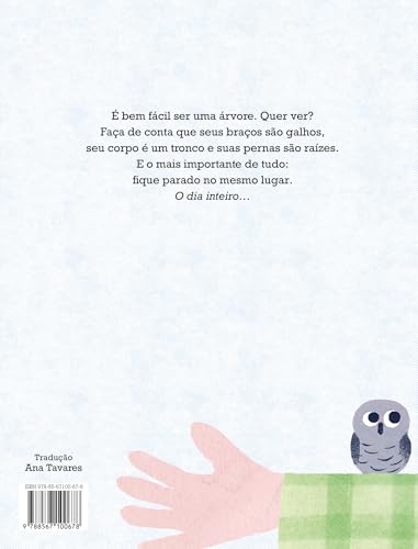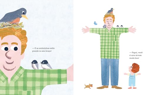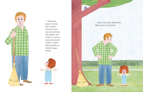 Com humor e ternura, esta história convida o leitor a embarcar em um faz de conta inusitado e mostra como momentos de brincadeira podem se transformar em boas lembranças. A pequena Madalena quer convencer seu pai a se juntar a ela em uma brincadeira de fingir ser uma árvore. Embora inicialmente relutante, o pai aceita participar “só por um minuto”. À medida que ele permanece imóvel, com os braços estendidos, diversos animais começam a interagir com ele: uma coruja cochila em seu ombro, um sabiá-laranjeira constrói um ninho em seu cabelo, insetos rastejam por seu corpo e até uma pipa se enrosca em sua cabeça. Mesmo enfrentando chuva e a chegada da noite, Madalena o lembra de que “árvores não se importam com essas coisas”. No final, ambos reconhecem que não são árvores, mas celebram o dia inteiro passado juntos ao ar livre. As ilustrações características de Agee, com seu humor peculiar e expressões faciais marcantes, complementam perfeitamente a narrativa. Uma divertida homenagem aos pais dispostos a ir além por seus filhos amantes da natureza − e uma excelente leitura para o Dia dos Pais ou para momentos de leitura compartilhada entre pais e filhos. Indicado para leitores a partir de 4 anos.