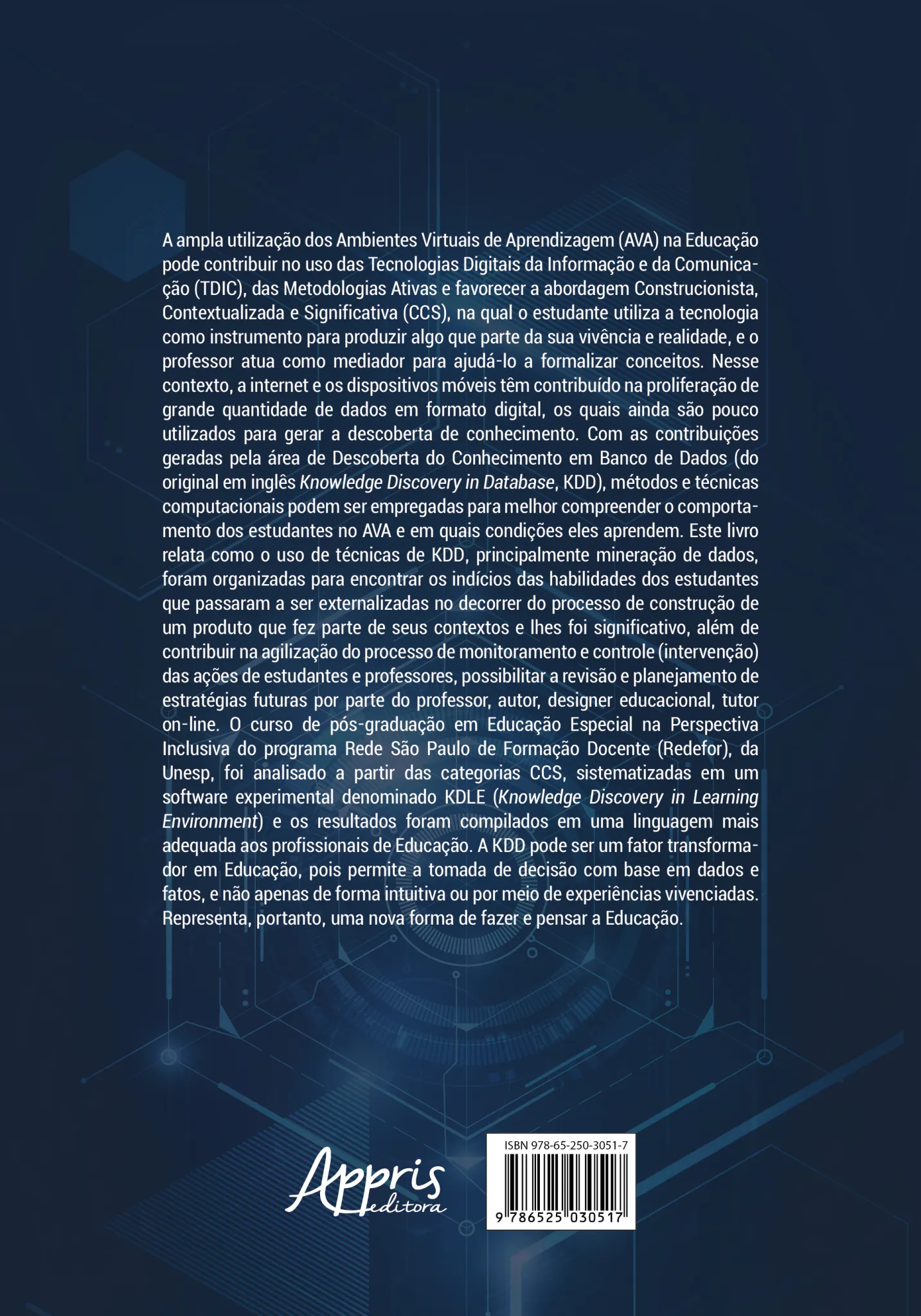 A ampla utilização dos Ambientes Virtuais de Aprendizagem (AVA) na Educação pode contribuir no uso das Tecnologias Digitais da Informação e da Comunicação (TDIC), das Metodologias Ativas e favorecer a abordagem Construcionista, Contextualizada e Significativa (CCS), na qual o estudante utiliza a tecnologia como instrumento para produzir algo que parte da sua vivência e realidade, e o professor atua como mediador para ajudá-lo a formalizar conceitos. Nesse contexto, a internet e os dispositivos móveis têm contribuído na proliferação de grande quantidade de dados em formato digital, os quais ainda são pouco utilizados para gerar a descoberta de conhecimento. Com as contribuições geradas pela área de Descoberta do Conhecimento em Banco de Dados (do original em inglês Knowledge Discovery in Database, KDD), métodos e técnicas computacionais podem ser empregadas para melhor compreender o comportamento dos estudantes no AVA e em quais condições eles aprendem. Este livro relata como o uso de técnicas de KDD, principalmente mineração de dados, foram organizadas para encontrar os indícios das habilidades dos estudantes que passaram a ser externalizadas no decorrer do processo de construção de um produto que fez parte de seus contextos e lhes foi significativo, além de contribuir na agilização do processo de monitoramento e controle (intervenção) das ações de estudantes e professores, possibilitar a revisão e planejamento de estratégias futuras por parte do professor, autor, designer educacional, tutor on-line. O curso de pós-graduação em Educação Especial na Perspectiva Inclusiva do programa Rede São Paulo de Formação Docente (Redefor), da Unesp, foi analisado a partir das categorias CCS, sistematizadas em um software experimental denominado KDLE (Knowledge Discovery in Learning Environment) e os resultados foram compilados em uma linguagem mais adequada aos profissionais de Educação. A KDD pode ser um fator transformador em Educação, pois permite a tomada de decisão com base em dados e fatos, e não apenas de forma intuitiva ou por meio de experiências vivenciadas. Representa, portanto, uma nova forma de fazer e pensar a Educação.