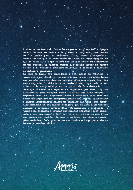 Mistérios no Morro do Castello se passa em plena Belle Époque do Rio de Janeiro, uma era de glamour e progresso, mas também de limitações para as mulheres. Cora, nossa protagonista, inicia um estágio no escritório do Corpo de Investigações do Rio de Janeiro, e o que parece ser um passatempo se transforma em uma ruptura de padrões quando ela decide seguir os passos do tio e se tornar a primeira mulher a se dedicar à carreira de detetive criminal.