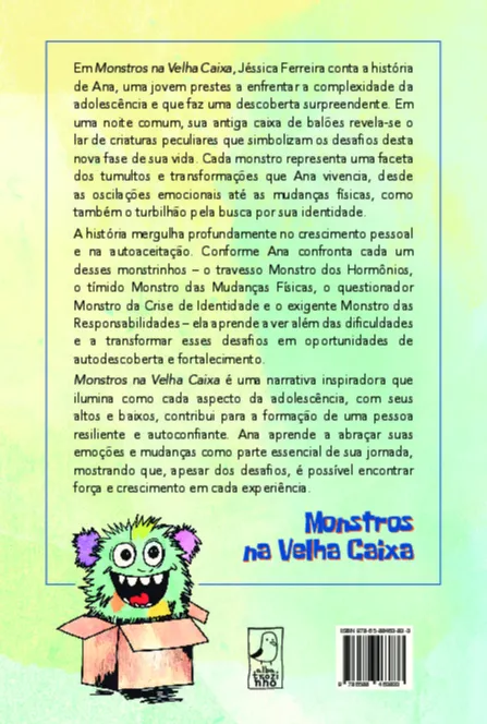 Enfrente os desafios da adolescência com Ana em Monstros na Velha Caixa ! Neste conto emocionante de Jéssica Ferreira, Ana descobre que sua antiga caixa de balões guarda monstrinhos peculiares, cada um representando as mudanças e desafios da adolescência. Do Monstro dos Hormônios ao Monstro da Crise de Identidade, ela enfrenta medos, dúvidas e transformações que toda jovem vivencia nessa fase Com coragem e autodescoberta, Ana aprende que cada desafio é uma chance de crescer e se fortalecer. Monstros na Velha Caixa é Garanta já o seu e inspire-se com Ana nessa jornada única!
