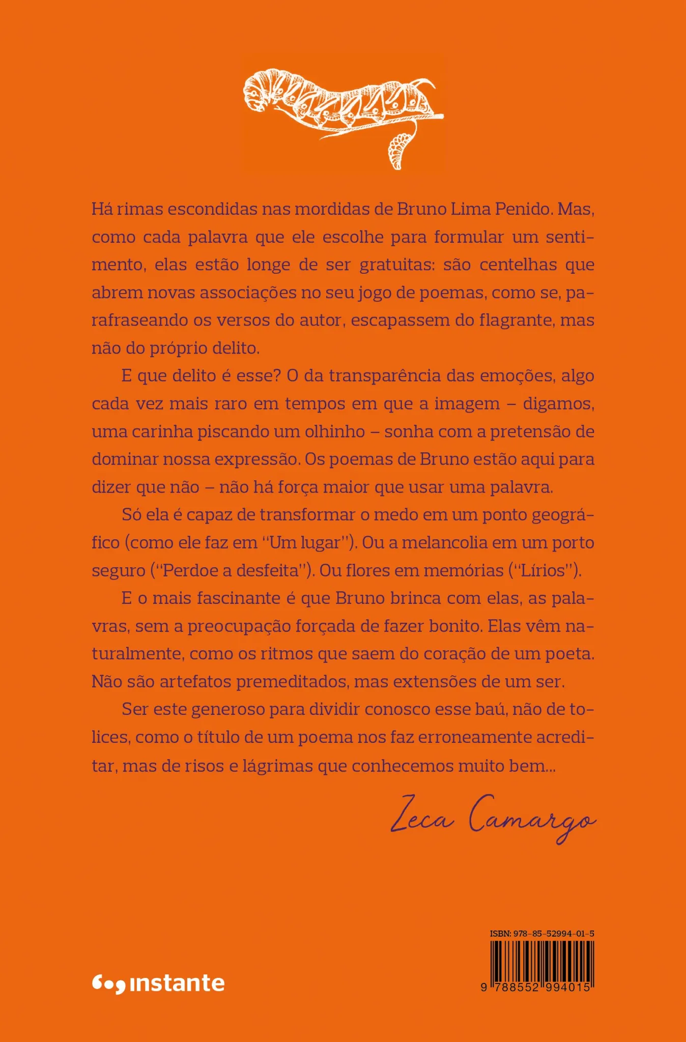 • O jornalista e apresentador Zeca Camargo elogia em seu texto de quarta capa: “E o mais fascinante é que Bruno brinca com elas, as palavras, sem a preocupação forçada de fazer bonito. Elas vêm naturalmente, como os ritmos que saem do coração de um poeta. Não são artefatos premeditados, mas extensões de um ser”.