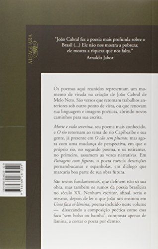 Os poemas escolhidos para integrar esta coletânea desnudam os elementos fundamentais da obra de João Cabral de Melo Neto. Morte e Vida Severina (1954-55), poema que dá nome ao livro, é a obra mais popular de João Cabral e aborda o tema da seca nordestina, dando voz aos retirantes que fazem o duro percurso entre o rio Capibaribe e Recife. O poema O rio também retrata o universo árido às margens do rio Capibaribe, mas dá voz a ele próprio como condutor da narrativa. Engenhos de cana-de-açúcar, usinas, retirantes e trabalhadores são retratados na velocidade do correr das águas. Em Paisagens com figuras (1955), João Cabral sintetiza em palavras uma de suas principais características, que é o hibridismo de linguagens. Mesclando descrições de imagens de Pernambuco, com paisagens da Espanha, o poeta desfila toda sua expressividade onírica. Por fim, Uma faca sem lâmina (1955), trata do desafio da composição poética, que ele ilustra numa faca sem bainha, que corta o poeta por dentro. * Leitura obrigatória do vestibular da UNICENTRO.