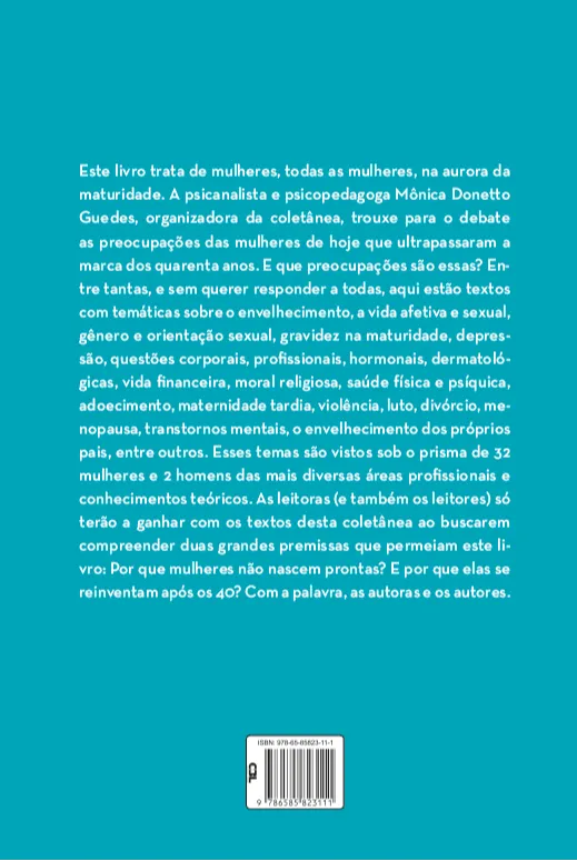 Este livro trata de mulheres, todas as mulheres, na aurora da maturidade. A psicanalista e psicopedagoga Mônica Donetto Guedes, organizadora da coletânea, trouxe para o debate as preocupações das mulheres de hoje que ultrapassaram a marca dos quarenta anos. E que preocupações são essas? Entre tantas, e sem querer responder a todas, aqui estão textos com temáticas sobre o envelhecimento, a vida afetiva e sexual, gênero e orientação sexual, gravidez na maturidade, depressão, questões corporais, profissionais, hormonais, dermatológicas, vida financeira, moral religiosa, saúde física e psíquica, adoecimento, maternidade tardia, violência, luto, divórcio, menopausa, transtornos mentais, o envelhecimento dos próprios pais, entre outros. Esses temas são vistos sob o prisma de 32 mulheres e 2 homens das mais diversas áreas profissionais e conhecimentos teóricos. As leitoras (e também os leitores) só terão a ganhar com os textos desta coletânea ao buscarem compreender duas grandes premissas que permeiam este livro: Por que mulheres não nascem prontas? E por que elas se reinventam após os 40? Com a palavra, as autoras e os autores.