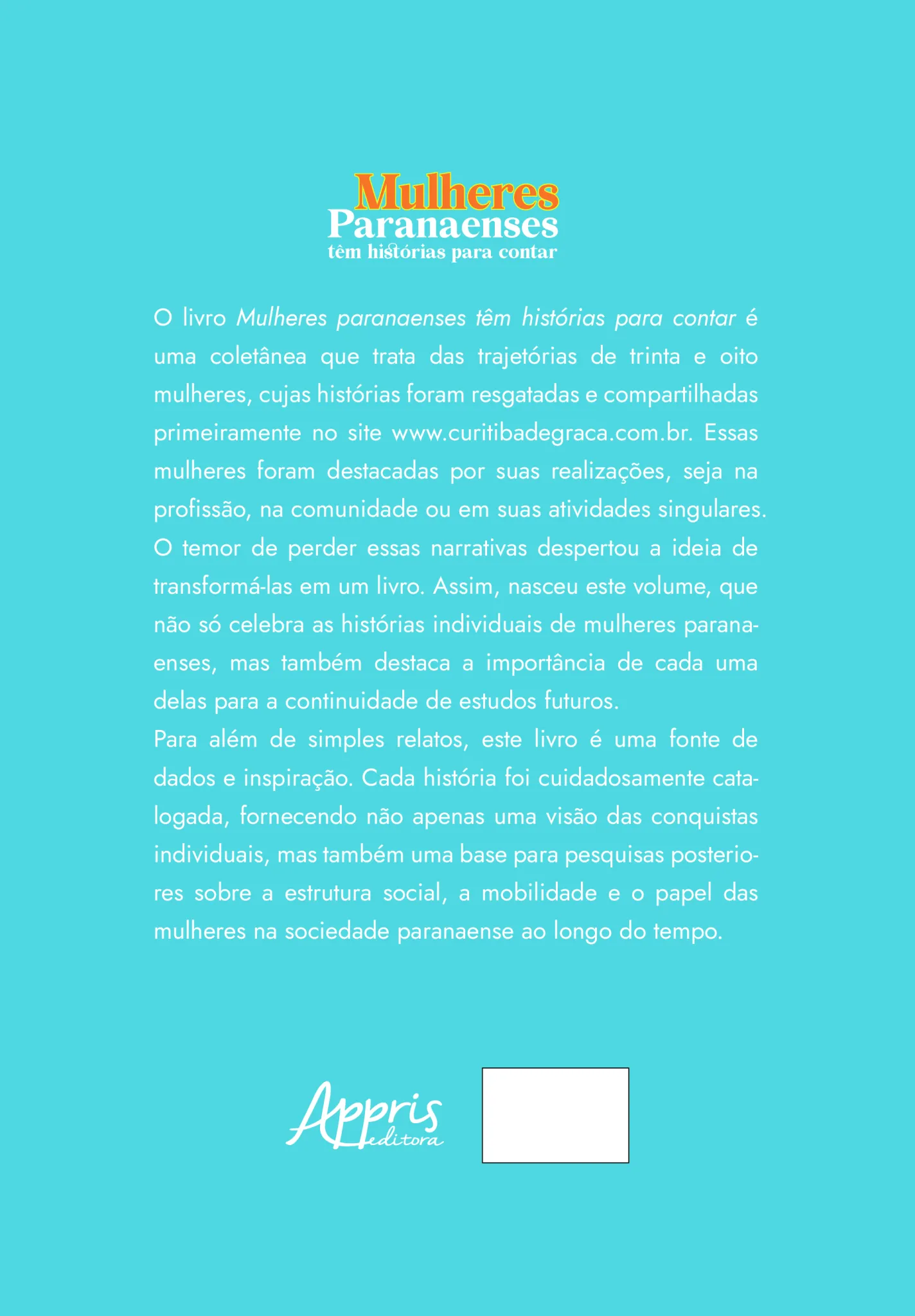 O livro Mulheres paranaenses têm histórias para contar é uma coletânea que trata das trajetórias de trinta e oito mulheres, cujas histórias foram resgatadas e compartilhadas primeiramente no site www.curitibadegraca.com.br. Essas mulheres foram destacadas por suas realizações, seja na profissão, na comunidade ou em suas atividades singulares. O temor de perder essas narrativas despertou a ideia de transformá-las em um livro. Assim, nasceu este volume, que não só celebra as histórias individuais de mulheres paranaenses, mas também destaca a importância de cada uma delas para a continuidade de estudos futuros.