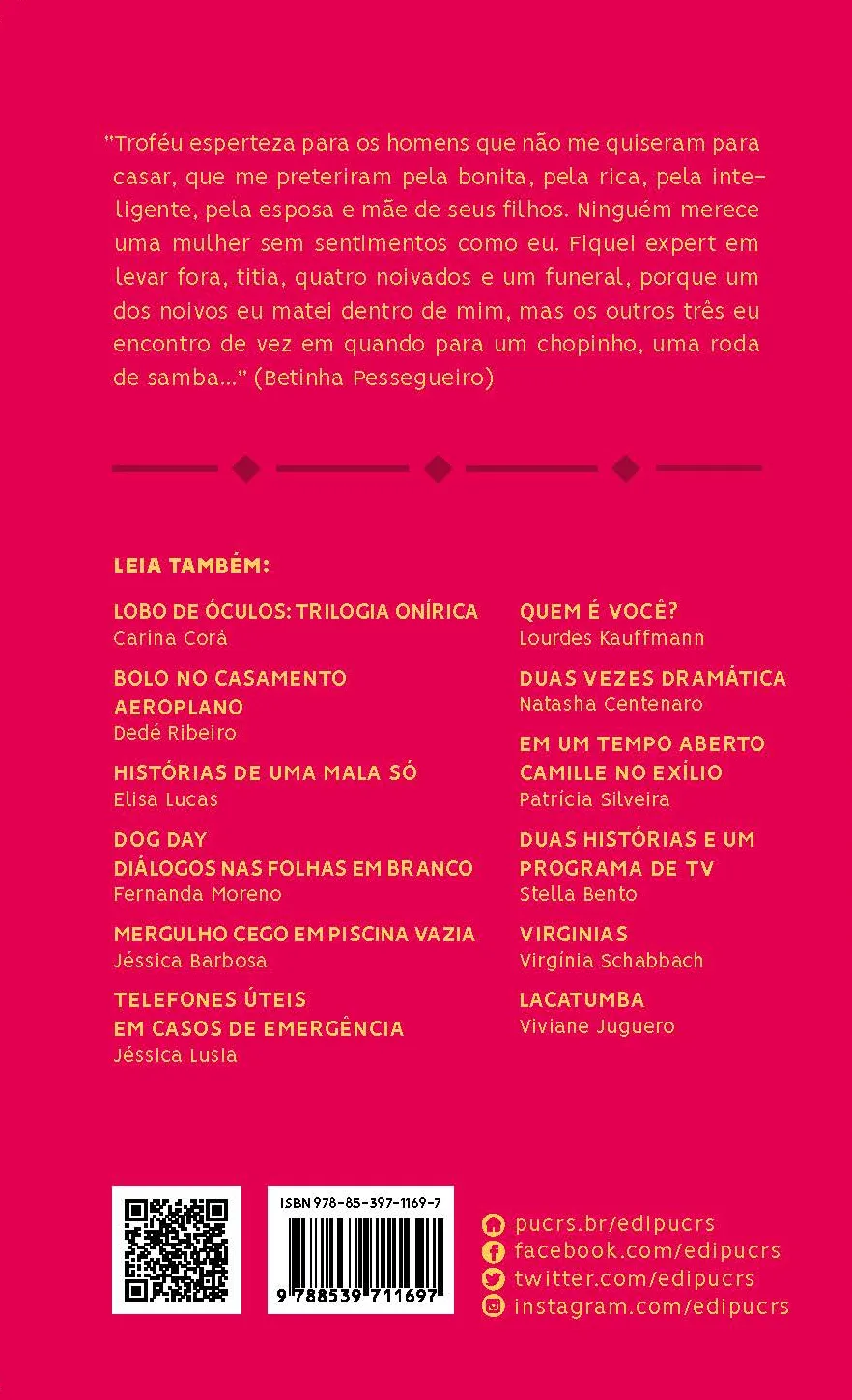 Troféu esperteza para os homens que não me quiseram para casar, que me preteriram pela bonita, pela rica, pela inteligente, pela esposa e mãe de seus filhos. Ninguém merece uma mulher sem sentimentos como eu. Fiquei expert em levar fora, titia, quatro noivados e um funeral, porque um dos noivos eu matei dentro de mim, mas os outros três eu encontro de vez em quando para um chopinho, uma roda de samba… (Betinha Pessegueiro)
