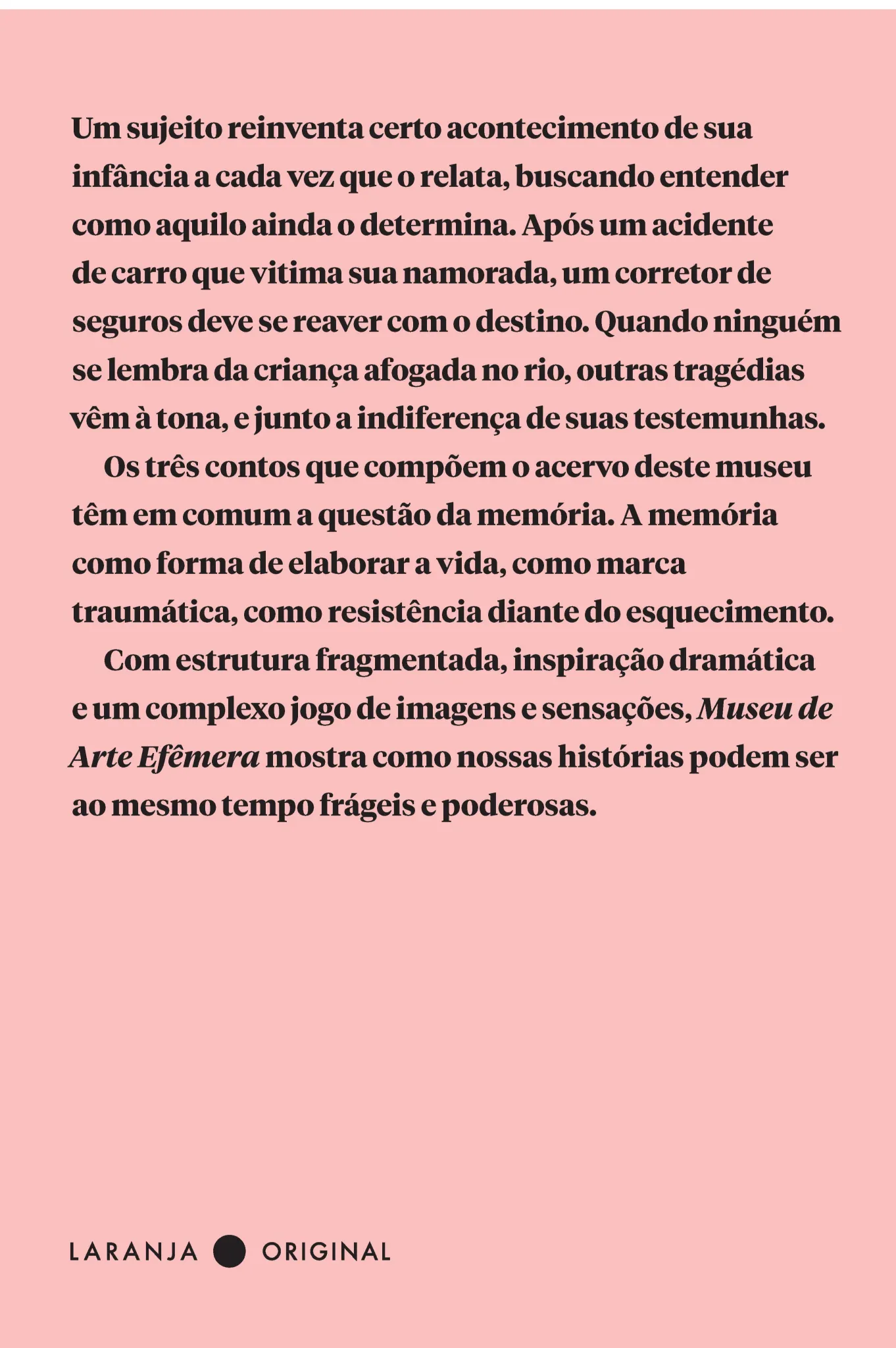 Um sujeito reinventa certo acontecimento de sua infância a cada vez que o relata, buscando entender como aquilo ainda o determina. Após um acidente de carro que vitima sua namorada, um corretor de seguros deve se reaver com o destino. Quando ninguém se lembra da criança afogada no rio, outras tragédias vêm à tona, e junto a indiferença de suas testemunhas. Os três contos que compõem o acervo deste museu têm em comum a questão da memória. A memória como forma de elaborar a vida, como marca traumática, como resistência diante do esquecimento. Com estrutura fragmentada, inspiração dramática e um complexo jogo de imagens e sensações, Museu de Arte Efêmera mostra como nossas histórias podem ser ao mesmo tempo frágeis e poderosas.