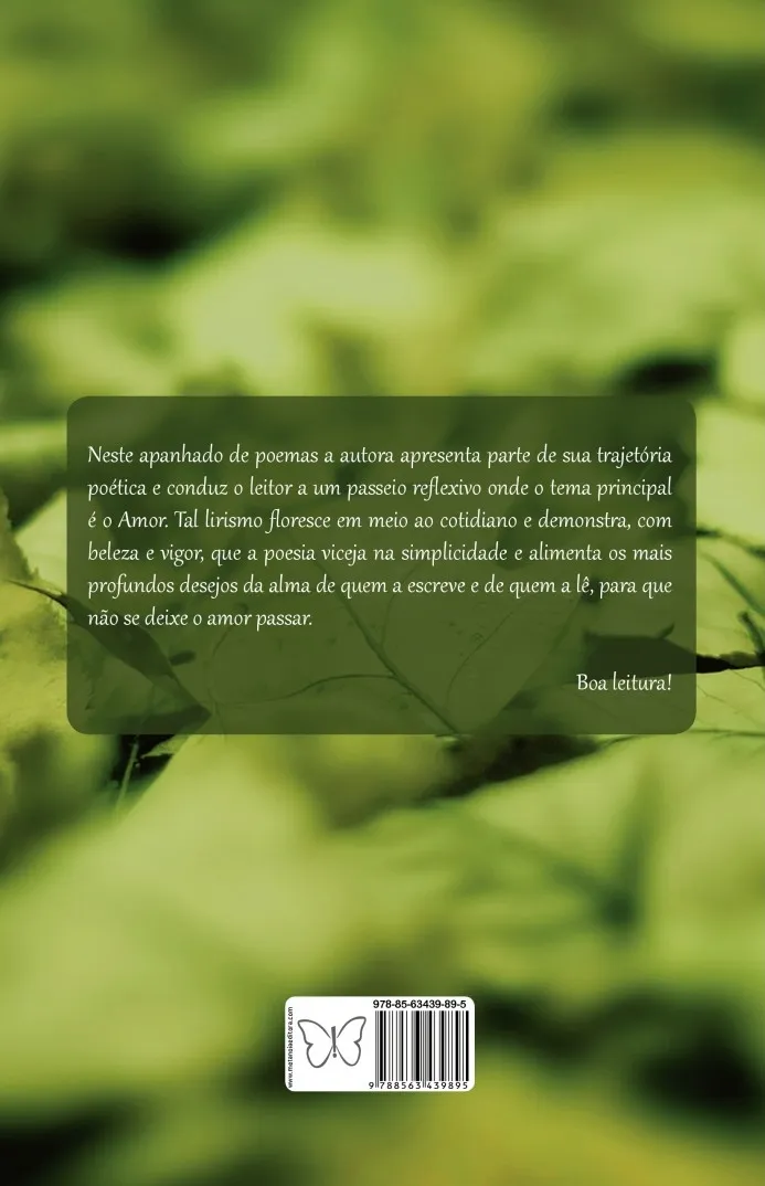 Neste apanhado de poemas a autora apresenta parte de sua trajetória poética e conduz o leitor a um passeio reflexivo onde o tema principal é o Amor. Tal lirismo floresce em meio ao cotidiano e demonstra com beleza e vigor que a poesia viceja na simplicidade e alimenta os mais profundos desejos da alma de quem a escreve e de quem a lê, para que não se deixe o amor passar.
