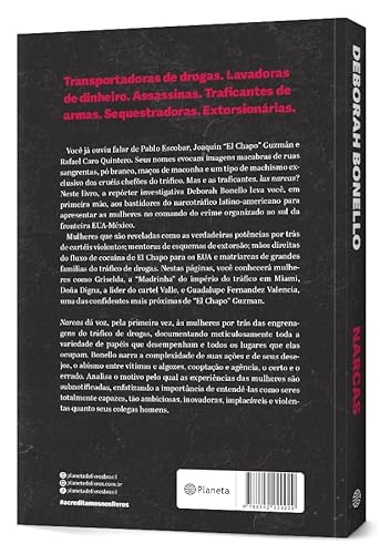 Transportadoras de drogas. Lavadoras de dinheiro. Assassinas. Traficantes de armas. Sequestradoras. Extorsionárias. Você já ouviu falar de Pablo Escobar, Joaquín “El Chapo” Guzmán e Rafael Caro Quintero. Seus nomes evocam imagens macabras de ruas sangrentas, pó branco, maços de maconha e um tipo de machismo exclusivo dos cruéis chefões do tráfico. Mas e as traficantes, las narcas? Neste livro, a repórter investigativa Deborah Bonello leva você, em primeira mão, aos bastidores do narcotráfico latino-americano para apresentar as mulheres no comando do crime organizado ao sul da fronteira EUA-México. Mulheres que são reveladas como as verdadeiras potências por trás de cartéis violentos, mentoras de esquemas de extorsão, mãos direitas do fluxo de cocaína de El Chapo para os EUA e matriarcas de grandes famílias do tráfico de drogas. Nestas páginas, você conhecerá mulheres como Griselda, a “Madrinha” do império do tráfico em Miami, Doña Digna, a líder do cartel Valle, e Guadalupe Fernández Valencia, uma das confidentes mais próximas de “El Chapo” Guzmán. Narcas dá voz, pela primeira vez, às mulheres por trás das engrenagens do tráfico de drogas, documentando meticulosamente toda a variedade de papéis que desempenham e todos os lugares que elas ocupam. Bonello narra a complexidade de suas ações e de seus desejos, o abismo entre vítimas e algozes, cooptação e agência, o certo e o errado. Analisa o motivo pelo qual as experiências das mulheres são subnotificadas, enfatizando a importância de entendê-las como seres totalmente capazes, tão ambiciosas, inovadoras, implacáveis e violentas quanto seus colegas homens.