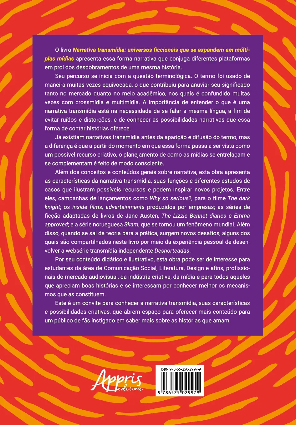 Além dos conceitos e conteúdos gerais sobre narrativa, esta obra apresenta as características da narrativa transmídia, suas funções e diferentes estudos de casos que ilustram possíveis recursos e podem inspirar novos projetos. Entre eles, campanhas de lançamentos como Why so serious?, para o filme The dark knight; os inside films, advertainments produzidos por empresas; as séries de ficção adaptadas de livros de Jane Austen, The Lizzie Bennet diaries e Emma approved; e a série norueguesa Skam, que se tornou um fenômeno mundial. Além disso, quando se sai da teoria para a prática, surgem novos desafios, alguns dos quais são compartilhados neste livro por meio da experiência pessoal de desenvolver a websérie transmídia independente Desnorteadas.