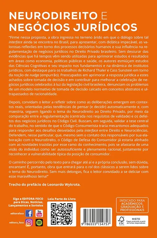 Firme nessa proposta, a obra ingressa no terreno árido em que o diálogo sobre tal interface ainda se encontra no Brasil, para apresentar, com didática impecável, as valorosas reflexões em torno dos processos decisórios humanos e sua influência na regulamentação de negócios jurídicos no Direito Privado brasileiro. Sem descurar das evidências que há tempos vêm sendo utilizadas para aprimorar estudos e resultados em áreas como economia, políticas públicas e saúde, os autores esmiúçam estudos das Ciências Cognitivas e seu impacto nos fundamentos e na dinâmica de institutos jurídicos, com destaque para os trabalhos de Richard Thaler e Cass Sunstein em torno da noção de nudge (empurrão). Preocupados em aprimorar a resposta jurídica a estes achados sobre tomada de decisão e em contribuir para melhorar a celebração de negócios jurídicos celebrados à luz da legislação civil brasileira, denunciam os problemas de um modelo normativo de tomada de decisão calcado em conceitos abstratos e ultrapassados de racionalidade.