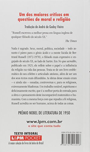 “Russell escreveu a melhor prosa em língua inglesa de qualquer filósofo do século XX.” The Times Nada é sagrado. Sexo, moral, política, sociedade – todo assunto é páreo para o gênio ácido e a mente lúcida de Bertrand Russell (1872-1970), o filósofo mais expressivo e engajado do século XX, ao lado de Sartre. Em No que acredito, publicado em 1925, ele reflete sobre o papel e a influência da religião na vida das pessoas. Trata-se de um livro emblemático do seu célebre e articulado ateísmo, além de ser um dos seus textos mais difundidos. As ideias desse ensaio eram – e ainda são – ousadas, controversas e, para os religiosos, extremamente blasfemas. Um trabalho notável, espirituoso e deliciosamente escrito, que é a melhor porta de entrada para a obra e o pensamento deste incomparável matemático e humanista. Com a mesma força com que repudia a fé religiosa, Russell acredita no ser humano, acima de todas as coisas.