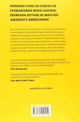 Os contos magistrais da premiada autora do best-seller Americanah chegam ao Brasil em aguardada edição. A escritora nigeriana Chimamanda Ngozi Adichie vem conquistando um público cada vez maior, tanto no Brasil como fora dele. Em 2007, seu romance Meio sol amarelo venceu o National Book Critics Circle Award e o Orange Prize de ficção, mas foi com o romance seguinte, Americanah, que ela atingiu o volume de leitores que a alavancou para o topo das listas de mais vendidos dos Estados Unidos, onde vive atualmente. Ao trabalho de ficcionista, somou-se a expressiva e incontornável militância da autora em favor da igualdade de gêneros e raça. Agora é a vez de os leitores brasileiros conhecerem a face de contista dessa grande autora já consagrada pelas formas do romance e do ensaio. Publicado em inglês em 2009, No seu pescoço contém todos os elementos que fazem de Adichie uma das principais escritoras contemporâneas. Nos doze contos que compõem o volume, encontramos a sensibilidade da autora voltada para a temática da imigração, da desigualdade racial, dos conflitos religiosos e das relações familiares. Combinando técnicas da narrativa convencional com experimentalismo, como no conto que dá nome ao livro — escrito em segunda pessoa —, Adichie parte da perspectiva do indivíduo para atingir o universal que há em cada um de nós e, com isso, proporciona a seus leitores a experiência da empatia, bem escassa em nossos tempos. * Leitura obrigatória do vestibular da UNICAMP.