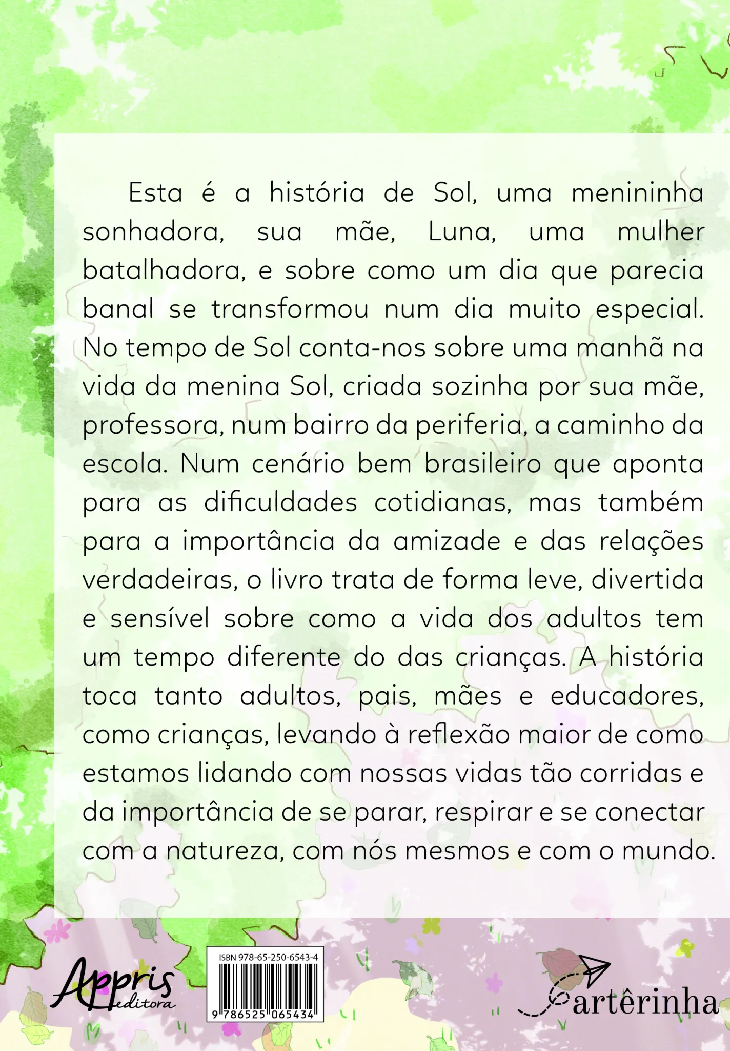 Esta é a história de Sol, uma menininha sonhadora, sua mãe, Luna, uma mulher batalhadora, e sobre como um dia que parecia banal se transformou num dia muito especial. No tempo de Sol conta-nos sobre uma manhã na vida da menina Sol, criada sozinha por sua mãe, professora, num bairro da periferia, a caminho da escola. Num cenário bem brasileiro que aponta para as dificuldades cotidianas, mas também para a importância da amizade e das relações verdadeiras, o livro trata de forma leve, divertida e sensível sobre como a vida dos adultos tem um tempo diferente do das crianças. A história toca tanto adultos, pais, mães e educadores, como crianças, levando à reflexão maior de como estamos lidando com nossas vidas tão corridas e da importância de se parar, respirar e se conectar com a natureza, com nós mesmos e com o mundo.