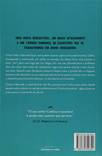 Uma noiva irresistível. Um noivo apaixonante. E um tórrido romance de escritório que se transformou em amor verdadeiro.em noiva irresistível, chloe mills e bennett ryan mal podem esperar pelos sinos matrimoniais. Chloe, exasperada e estressada por todos os arranjos de última hora, está prestes a dizer “sim” para uma fuga até las vegas. Por sua vez, bennett teve a brilhante ideia de evitar sexo antes do casamento, regra que apenas piorou o mau humor dos dois. Quando seus familiares malucos chegam para o grande dia, os fogosos amantes irão descobrir se um casal que discute tanto pode continuar junto tempo o bastante para trocar alianças – e não apenas provocações.chloe e bennett, o casal favorito das fãs, passaram por muita coisa juntos desde aquela noite ardente na sala de conferência em cretino irresistível – agora, junte-se a eles para o casamento do século.”o sex-seller cretino irresistível é ainda mais quente do que cinquenta tons.”– elle magazine francesa.