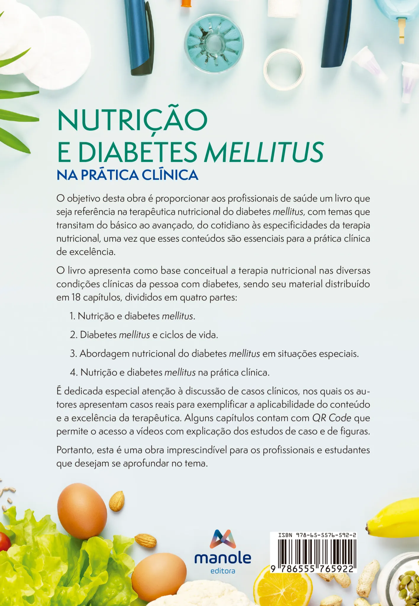 O livro apresenta como base conceitual a terapia nutricional nas diversas condições clínicas da pessoa com diabetes, sendo seu material distribuído em 18 capítulos, divididos em quatro partes: