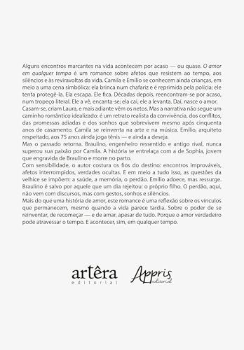 Alguns encontros marcantes na vida acontecem por acaso — ou quase. O amor em qualquer tempo é um romance sobre afetos que resistem ao tempo, aos silêncios e às reviravoltas da vida. Camila e Emílio se conhecem ainda crianças, em meio a uma cena simbólica: ela brinca num chafariz e é reprimida pela polícia; ele tenta protegê-la. Ela escapa. Ele fica. Décadas depois, reencontram-se por acaso, num tropeço literal. Ele a vê, encanta-se; ela cai, ele a levanta. Daí, nasce o amor. Casam-se, criam Laura, e mais adiante vêm os netos. Mas a narrativa não segue um caminho romântico idealizado: é um retrato realista da convivência, dos conflitos, das promessas adiadas e dos sonhos que sobrevivem mesmo após cinquenta anos de casamento. Camila se reinventa na arte e na música. Emílio, arquiteto respeitado, aos 75 anos ainda joga tênis — e ainda a deseja.