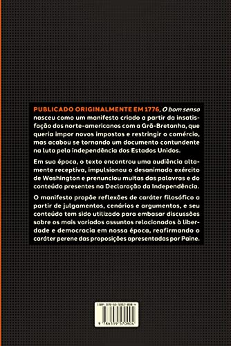 Publicado originalmente em 1776, O bom senso nasceu como um manifesto criado a partir da insatisfação dos norte-americanos com a Grã-Bretanha, que queria impor novos impostos e restringir o comércio, mas acabou se tornando um documento contundente na luta pela independência dos Estados Unidos.