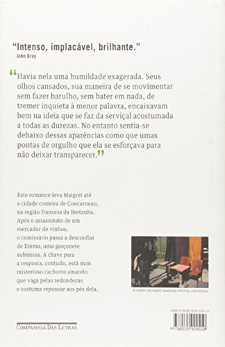 Georges Simenon reinventou a literatura de mistério. Antes dele, o que definia os romances do gênero era a busca pelo assassino. O escritor deixava uma série de pistas ao longo do livro e cabia ao leitor, ao fim, juntar as peças para tentar adivinhar a identidade do criminoso. Depois do surgimento do Comissário Maigret, em 1931, o cenário mudou. Simenon fez da identidade do matador uma questão menor em relação ao que realmente importava para ele: as motivações do crime. Seus assassinos não são apenas vilões, mas personagens complexos, de grande densidade psicológica, para quem o crime é por vezes a única saída. A pergunta não era mais “quem matou”, mas “por quê”? Maigret, nesse sentido, é uma mistura de policial, detetive e psicólogo, sempre disposto a decifrar as mínimas nuances da personalidade de quem está investigando. O cachorro amarelo se passa na cidade costeira de Concarneau, na região francesa da Bretanha. Após o assassinato de um mercador de vinhos, Maigret passa a desconfiar de Emma, uma garçonete submissa. A chave para a resposta, contudo, está num misterioso cachorro amarelo que vaga pelas redondezas e costuma repousar aos pés de Emma. A popularidade do comissário Maigret – seu personagem mais famoso – e as diversas adaptações para o audiovisual contribuíram para reforçar a imagem de Georges Simenon como um autor de livros para consumo rápido. Nada mais equivocado. Simenon figura entre os grandes escritores do século XX. Entre seus milhares de admiradores ilustres, André Gide, Charles Chaplin, Henry Miller, William Faulkner e Federico Fellini eram os primeiros da fila. Além das muitas histórias policiais, produziu 41 “romances duros”, obras em geral maiores no tamanho e na ambição, construídas fora dos esquadros das tramas de investigação e não raro incluídas no cânone da literatura europeia.