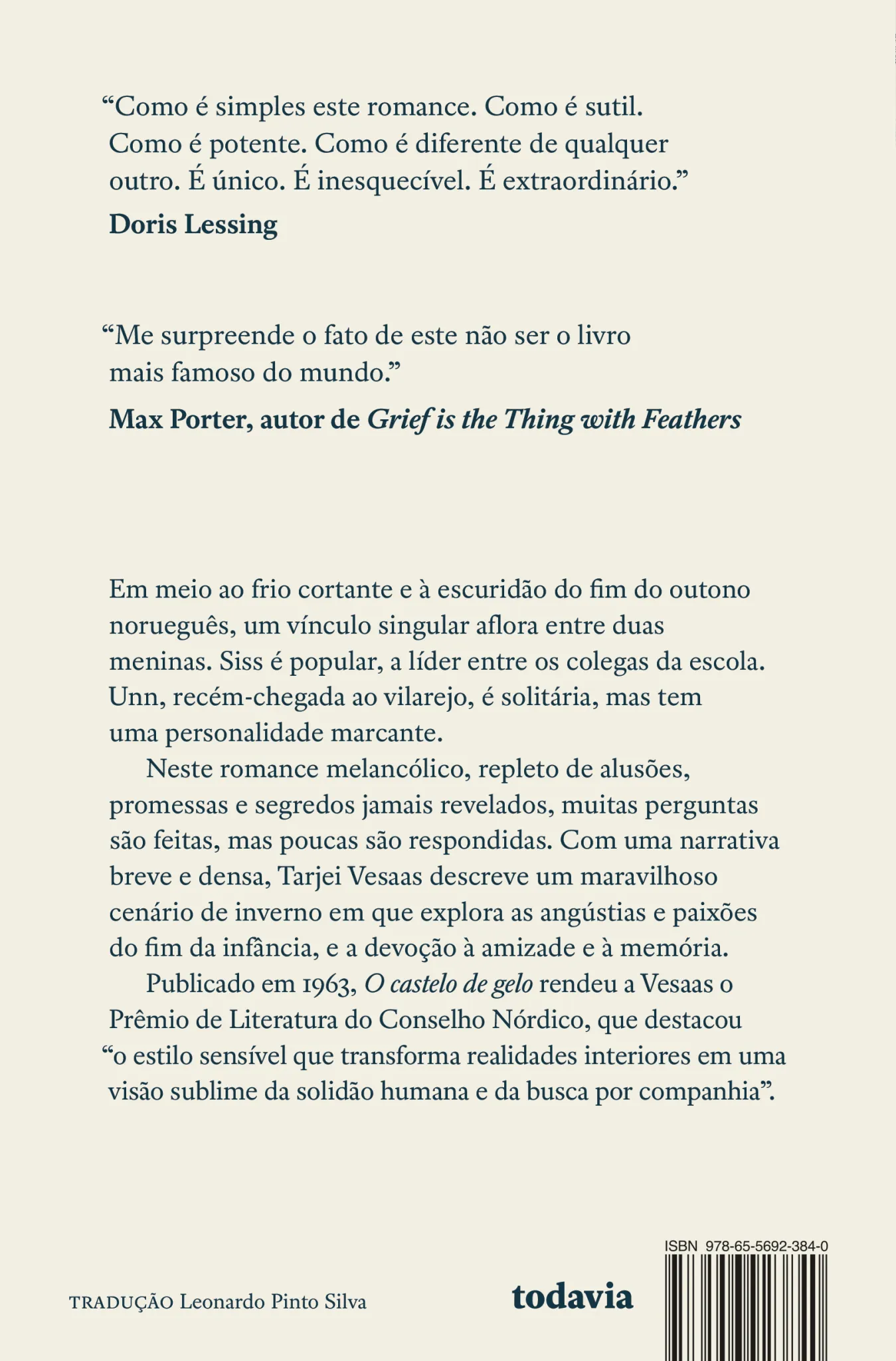 Em meio ao frio cortante e à escuridão do fim do outono norueguês, um vínculo singular aflora entre duas meninas. Siss é popular, a líder da escola. Unn é solitária, mas tem uma personalidade marcante. Publicado em 1963, o melancólico romance O castelo de gelo rendeu a Tarjei Vesaas o Prêmio de Literatura do Conselho Nórdico, que destacou “o estilo sensível que transforma realidades interiores em uma visão sublime da solidão humana e da busca por companhia”.