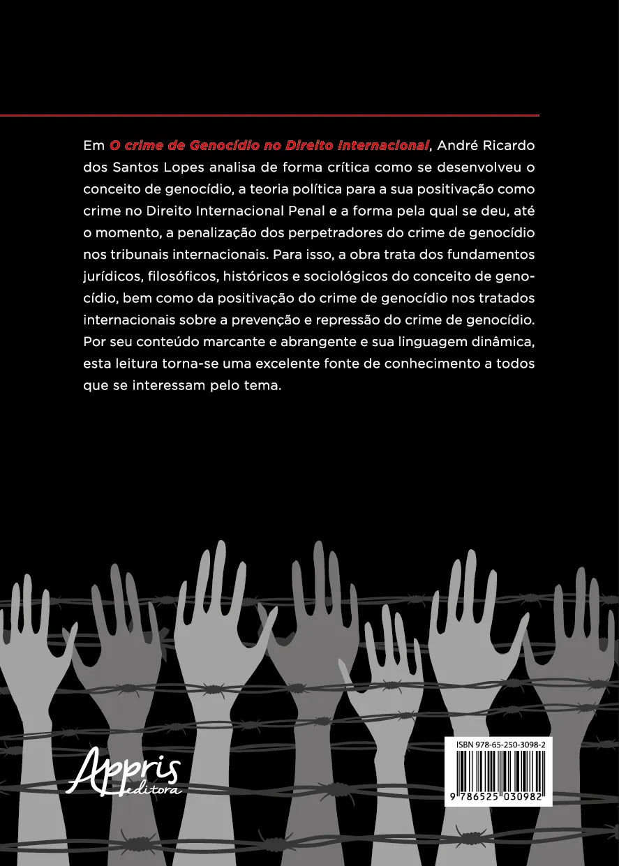 Em O crime de Genocídio no Direito Internacional, André Ricardo dos Santos Lopes analisa de forma crítica como se desenvolveu o conceito de genocídio, a teoria política para a sua positivação como crime no Direito Internacional Penal e a forma pela qual se deu, até o momento, a penalização dos perpetradores do crime de genocídio nos tribunais internacionais. Para isso, a obra trata dos fundamentos jurídicos, filosóficos, históricos e sociológicos do conceito de genocídio, bem como da positivação do crime de genocídio nos tratados internacionais sobre a prevenção e repressão do crime de genocídio. Por seu conteúdo marcante e abrangente e sua linguagem dinâmica, esta leitura torna-se uma excelente fonte de conhecimento a todos que se interessam pelo tema.