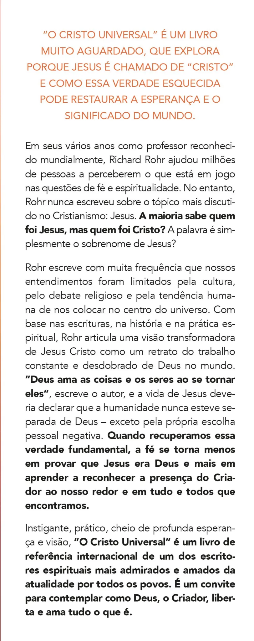Rohr escreve com muita frequência que nossos entendimentos foram limitados pela cultura, pelo debate religioso e pela tendência humana de nos colocar no centro do universo. Com base nas escrituras, na história e na prática espiritual, Rohr articula uma visão transformadora de Jesus Cristo como um retrato do trabalho constante e desdobrado de Deus no mundo. “Deus ama as coisas e os seres ao se tornar eles”, escreve o autor, e a vida de Jesus deveria declarar que a humanidade nunca esteve separada de Deus – exceto pela própria escolha pessoal negativa. Quando recuperamos essa verdade fundamental, a fé se torna menos em provar que Jesus era Deus e mais em aprender a reconhecer a presença do Criador ao nosso redor e em tudo e todos que encontramos.
