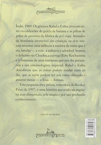 Elogiado livro de estréia da indiana Arundhati Roy, O deus das pequenas coisas narra a história dos gêmeos Rahel e Estha, que, na Índia de 1969, crescem entre os caldeirões de geléia de banana e as pilhas de grãos de pimenta da fábrica da avó cega. Armados da inocência invencível das crianças, os dois tentam inventar uma infância à sombra da ruína que é sua família – a mãe, a solitária e adorável Ammu; o delicioso tio Chacho; a inimiga Baby Kochamma e o fantasma de uma mariposa que um dia pertenceu a um entomologista imperial. Rahel e Estha descobrem que as coisas podem mudar num só dia, que as vidas podem ter seu rumo alterado e assumir novas – e feias – formas. Descobrem que elas podem até cessar para sempre. Ancorada na angústia mas alimentada pela magia e por um profundo conhecimento, esta pequena obra-prima ganhou o prêmio britânico Booker Prize de 1997, foi editada em 36 países e encabeçou por semanas a lista de mais vendidos na Grã-Bretanha, Austrália, Índia e Noruega, na época de seu lançamento.