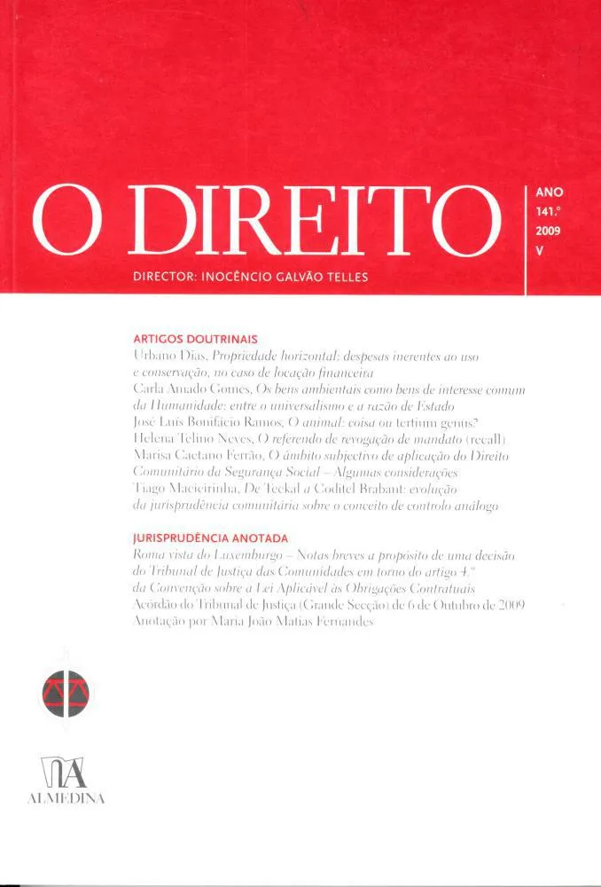 A obra traz: Propriedade horizontal: desfasas inerentes ao uso e conservação, no caso de locação financeira; Os bens ambientais como bens de interesse comum da Humanidade: entre o universalismo e a razão de Estado; O animal: coisa ou tertium genus?; O referendo de revogação de mandato (recall); O âmbito subjectivo de aplicação do Direito Comunitário da Segurança Social – Algumas considerações.
