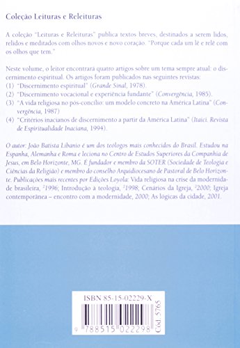 Em 1977, Pe. Libanio publicou nas Edições Loyola um livro intitulado Discernimento espiritual, com duas edições (1977, 21983). Depois, publicou quatro artigos sobre o tema do discernimento na revista Convergência, em 1985; A vida religiosa no pós-Concílio , na revista Convergência, em 1987 e Critérios inacianos de discernimento a partir da América Latina em Itaici. Estes textos se tornaram referenciais na área e por isso foram reunidos no quarto volume da coleção Leituras Releituras com o título O discernimento espiritual revisitado, para serem lidos, relidos e meditados com novos olhos e coração, possibilitando aos leitores fazerem o exercício do discernimento sem ilusão ou auto-engano.