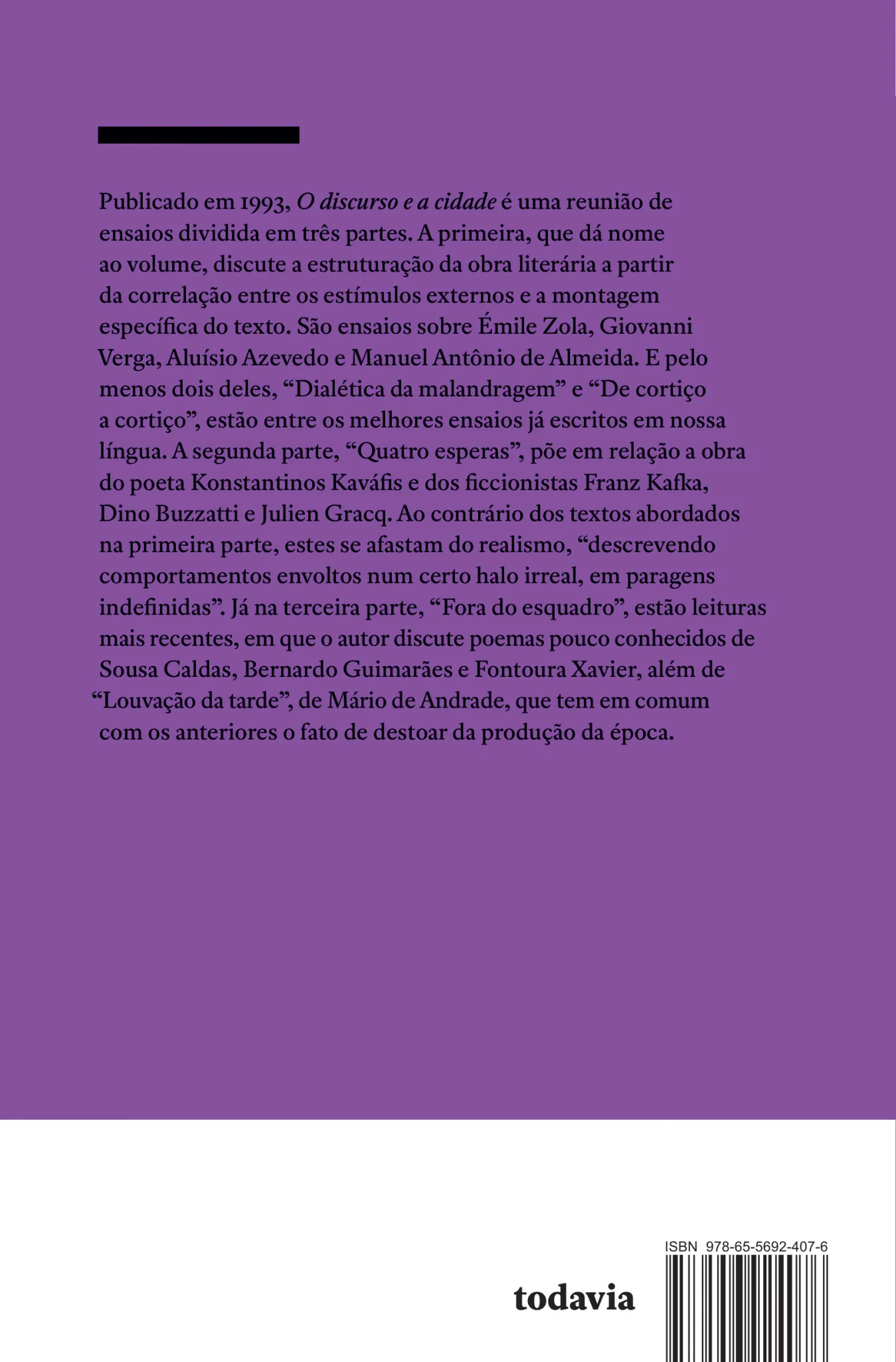 Publicado em 1993, O discurso e a cidade é uma reunião de ensaios dividida em três partes. A primeira, que dá nome ao volume, discute a estruturação da obra literária a partir da correlação entre os estímulos externos e a montagem específica do texto. “Dialética da Malandragem”, um desses ensaios, é um dos mais influentes da crítica literária brasileira.