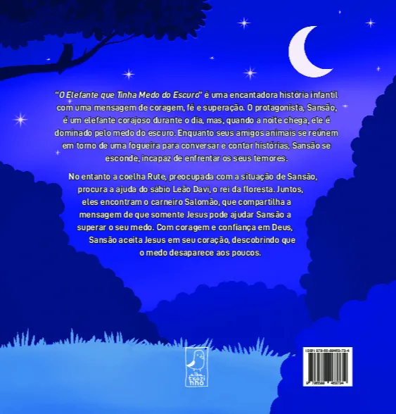 “O Elefante que Tinha Medo do Escuro” é uma encantadora história infantil com uma mensagem de coragem, fé e superação. O protagonista, Sansão, é um elefante corajoso durante o dia, mas, quando a noite chega, ele é dominado pelo medo do escuro. Enquanto seus amigos animais se reúnem em torno de uma fogueira para conversar e contar histórias, Sansão se esconde, incapaz de enfrentar os seus temores. No entanto a coelha Rute, preocupada com a situação de Sansão, procura a ajuda do sábio Leão Davi, o rei da floresta. Juntos, eles encontram o carneiro Salomão, que compartilha a mensagem de que somente Jesus pode ajudar Sansão a superar o seu medo. Com coragem e confiança em Deus, Sansão aceita Jesus em seu coração, descobrindo que o medo desaparece aos poucos.