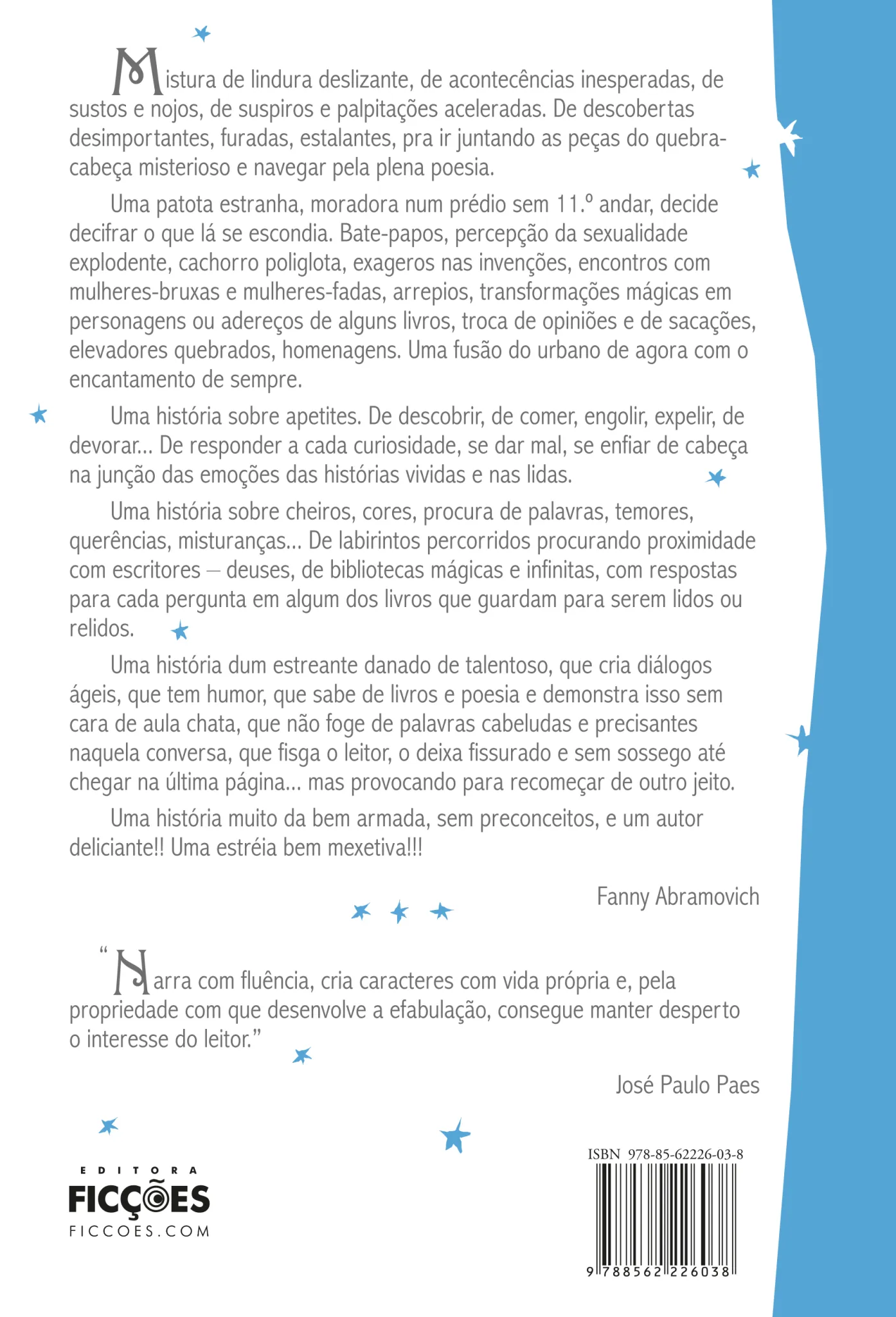 Uma história dum estreante danado de talentoso, que cria diálogos ágeis, que tem humor, que sabe de livros e poesia e demonstra isso sem cara de aula chata, que não foge de palavras cabeludas e precisantes naquela conversa, que fisga o leitor, o deixa fissurado e sem sossego até chegar na última página… mas provocando para recomeçar de outro jeito.