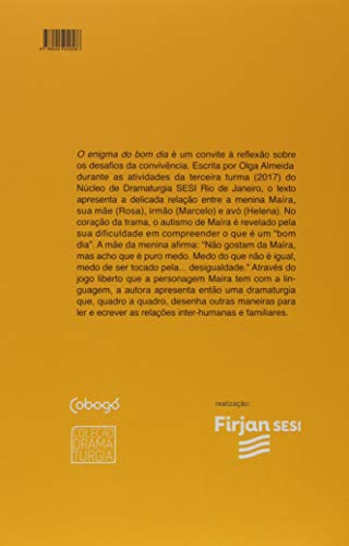 O enigma do bom dia é um convite à reflexão sobre os desafios da convivência. Escrita por Olga Almeida durante as atividades da terceira turma (2017) do Núcleo de Dramaturgia SESI Rio de Janeiro, a dramaturgia apresenta a delicada relação entre a menina Maíra, sua mãe (Rosa), irmão (Marcelo) e avó (Helena). No coração da trama, o autismo de Maíra é revelado através de sua dificuldade em compreender o que é um “bom dia”. A mãe da menina afirma: “Não gostam da Maíra, mas acho que é puro medo. Medo do que não é igual, medo de ser tocado pela… desigualdade”. Através do jogo liberto que a personagem Maíra tem com a linguagem, a autora apresenta então uma dramaturgia que, quadro a quadro, desenha outras maneiras para ler e escrever as relações inter-humanas e familiares.