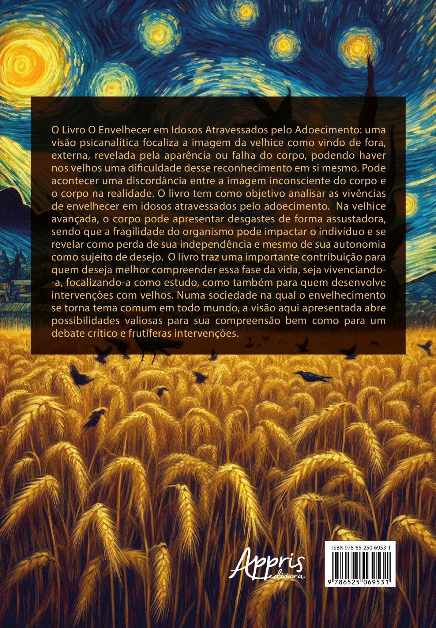 O Livro O Envelhecer em Idosos Atravessados pelo Adoecimento: uma visão psicanalítica focaliza a imagem da velhice como vindo de fora, externa, revelada pela aparência ou falha do corpo, podendo haver nos velhos uma dificuldade desse reconhecimento em si mesmo. Pode acontecer uma discordância entre a imagem inconsciente do corpo e o corpo na realidade. O livro tem como objetivo analisar as vivências de envelhecer em idosos atravessados pelo adoecimento. Na velhice avançada, o corpo pode apresentar desgastes de forma assustadora, sendo que a fragilidade do organismo pode impactar o indivíduo e se revelar como perda de sua independência e mesmo de sua autonomia como sujeito de desejo. O livro traz uma importante contribuição para quem deseja melhor compreender essa fase da vida, seja vivenciando-a, focalizando-a como estudo, como também para quem desenvolve intervenções com velhos. Numa sociedade na qual o envelhecimento se torna tema comum em todo mundo, a visão aqui apresentada abre possibilidades valiosas para sua compreensão bem como para um debate crítico e frutíferas intervenções.