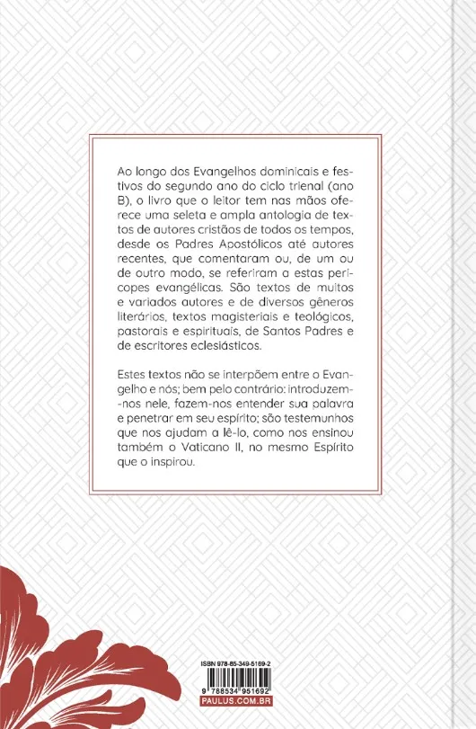 Ao longo dos Evangelhos dominicais e festivos do segundo ano do ciclo trienal (ano B), o livro que o leitor tem nas mãos oferece uma seleta e ampla antologia de textos de autores cristãos de todos os tempos, desde os Padres Apostólicos até autores recentes, que comentaram ou, de um ou de outro modo, se referiram a estas perícopes evangélicas. São textos de muitos e variados autores e de diversos gêneros literários, textos magisteriais e teológicos, pastorais e espirituais, de Santos Padres e de escritores eclesiásticos. Estes textos não se interpõem entre o Evangelho e nós; bem pelo contrário: introduzem- -nos nele, fazem-nos entender sua palavra e penetrar em seu espírito; são testemunhos que nos ajudam a lê-lo, como nos ensinou também o Vaticano II, no mesmo Espírito que o inspirou.