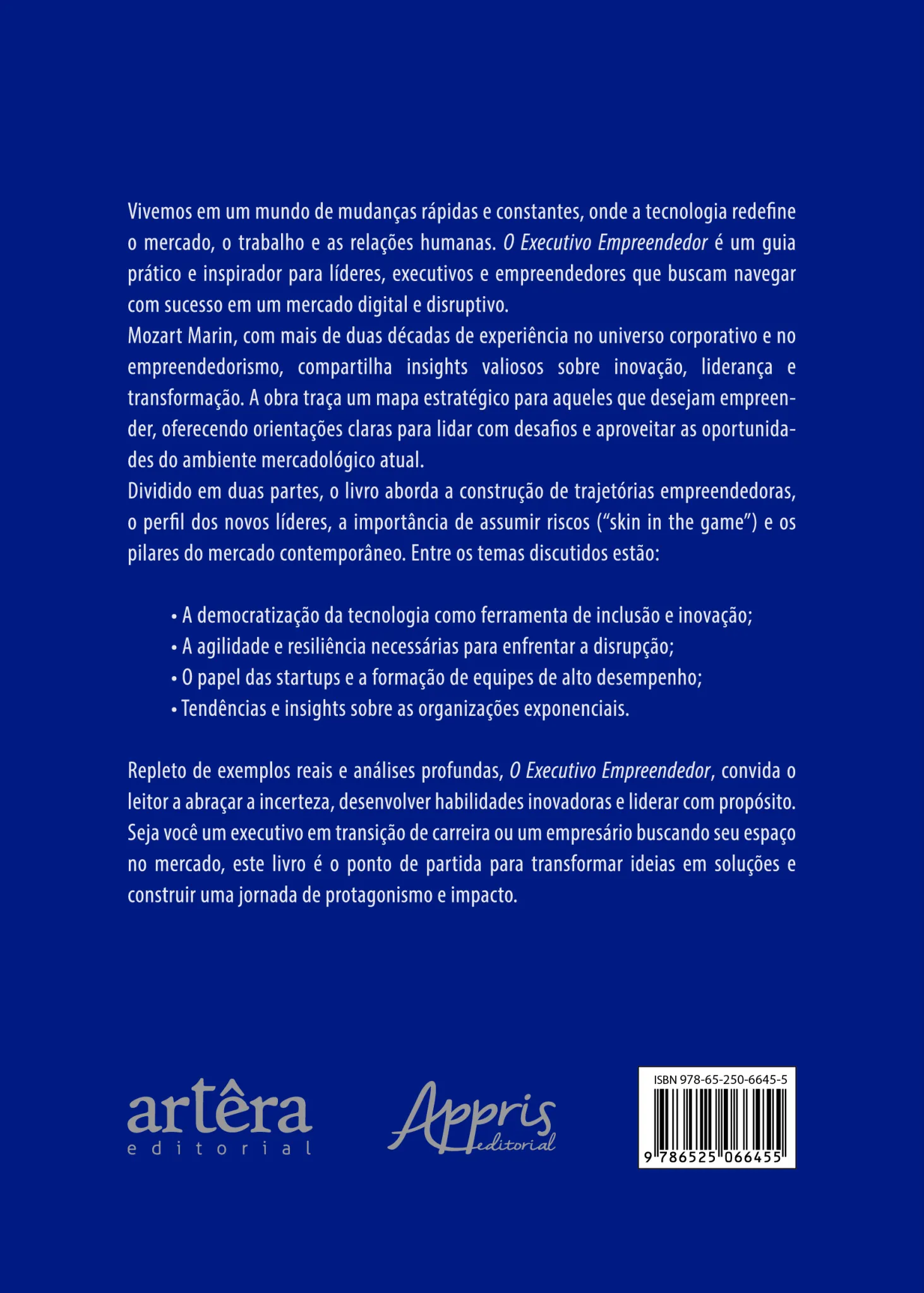 Mozart Marin, com mais de duas décadas de experiência no universo corporativo e no empreendedorismo, compartilha insights valiosos sobre inovação, liderança e transformação. A obra traça um mapa estratégico para aqueles que desejam empreender, oferecendo orientações claras para lidar com desafios e aproveitar as oportunidades do ambiente mercadológico atual.