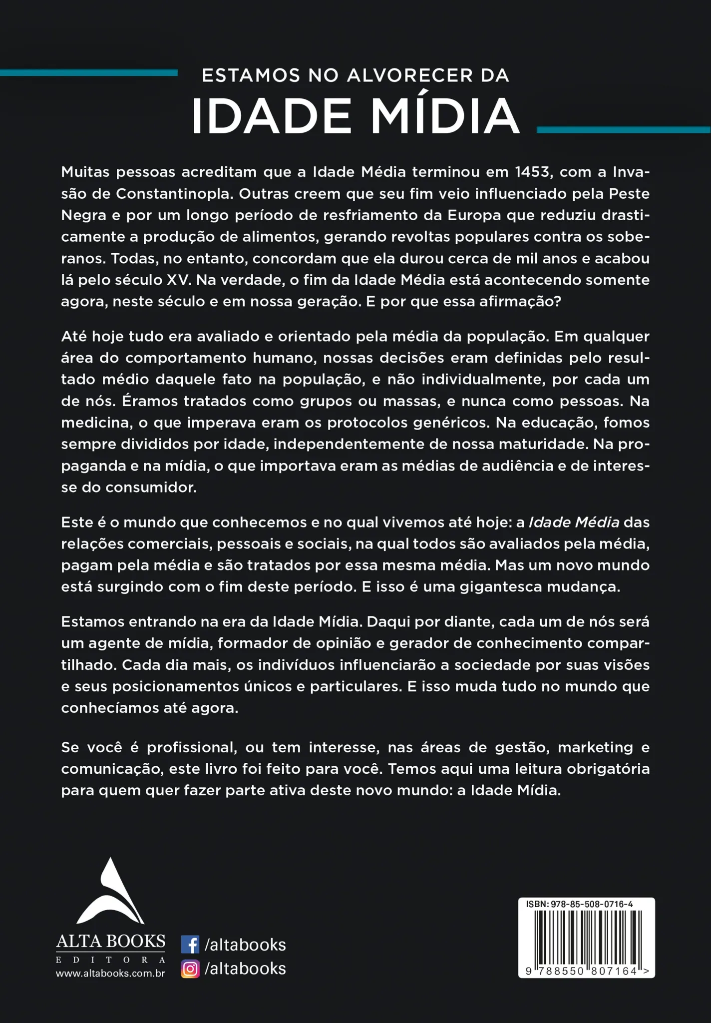 A cada dia, nossa interação social com os aspectos do mundo ao nosso redor se transforma irrestritamente. Não há limites para as mudanças em curso: estamos nos reinventando. Essas transformações não resultam do acaso. Vivemos um período de transição no qual consolidamos uma nova Era. Você está pronto para a Idade Mídia? Esta obra detalha esse novo paradigma de vida. Daqui por diante, seremos reconhecidos pela potencialidade de nossa individualidade, por nossas características mais singulares.