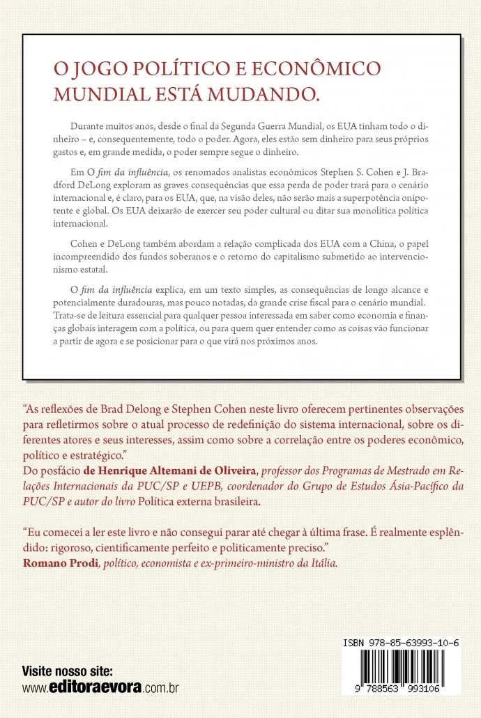 Dá para perceber claramente que o jogo político e econômico mundial está mudando. Durante muitos anos, desde o final da Segunda Guerra Mundial, os EUA tinham todo o dinheiro – e, consequentemente, todo o poder. Agora, eles estão sem dinheiro para seus próprios gastos e, em grande medida, o poder sempre segue o dinheiro. Em O Fim da Influência, os renomados analistas econômicos Stephen S. Cohen e J. Bradford De Long exploram as graves consequências que essa perda de poder trará para o cenário internacional e, é claro, para os EUA, que, na visão deles, não serão mais a superpotência onipotente e global. Assim sendo, os EUA deixarão de exercer seu poder cultural ou ditar sua monolítica política internacional. Mais prejudicial, porém, é, na visão dos autores, o golpe à capacidade do mundo em inovar econômica, financeira e politicamente. Cohen e DeLong também exploram a relação complicada com a China, o papel incompreendido dos fundos soberanos, e o retorno de capitalismo submetido ao intervencionismo estatal. Trata-se de leitura essencial para qualquer pessoa interessada em saber como economia e finanças globais interagem com a política. O Fim da Influência explica, em um texto simples e extremamente fluido, as consequências de longo alcance e potencialmente duradouras, mas pouco notadas, da grande crise fiscal para o cenário mundial.