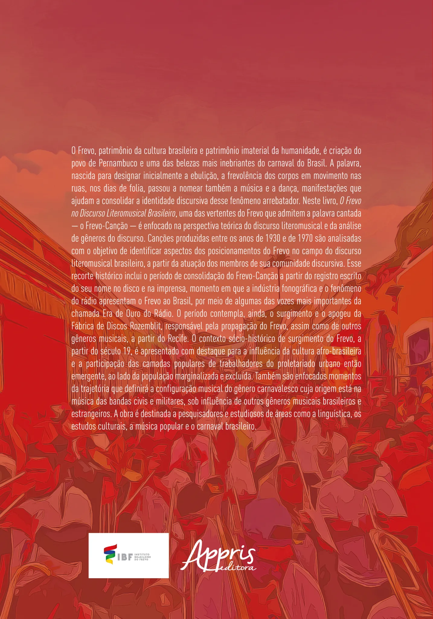 O Frevo, patrimônio da cultura brasileira e patrimônio imaterial da humanidade, é criação do povo de Pernambuco e uma das belezas mais inebriantes do carnaval do Brasil. A palavra, nascida para designar inicialmente a ebulição, a frevolência dos corpos em movimento nas ruas, nos dias de folia, passou a nomear também a música e a dança, manifestações que ajudam a consolidar a identidade discursiva desse fenômeno arrebatador. Neste livro, O Frevo no Discurso Literomusical Brasileiro, uma das vertentes do Frevo que admitem a palavra cantada — o Frevo-Canção — é enfocado na perspectiva teórica do discurso literomusical e da análise de gêneros do discurso. Canções produzidas entre os anos de 1930 e de 1970 são analisadas com o objetivo de identificar aspectos dos posicionamentos do Frevo no campo do discurso literomusical brasileiro, a partir da atuação dos membros de sua comunidade discursiva. Esse recorte histórico inclui o período de consolidação do Frevo-Canção a partir do registro escrito do seu nome no disco e na imprensa, momento em que a indústria fonográfica e o fenômeno do rádio apresentam o Frevo ao Brasil, por meio de algumas das vozes mais importantes da chamada Era de Ouro do Rádio. O período contempla, ainda, o surgimento e o apogeu da Fábrica de Discos Rozemblit, responsável pela propagação do Frevo, assim como de outros gêneros musicais, a partir do Recife. O contexto sócio-histórico de surgimento do Frevo, a partir do século 19, é apresentado com destaque para a influência da cultura afro-brasileira e a participação das camadas populares de trabalhadores do proletariado urbano então