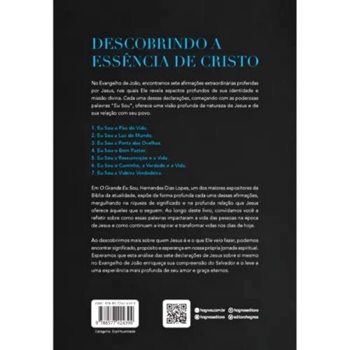 DESCOBRINDO A ESSÊNCIA DE CRISTO No Evangelho de João, encontramos sete afirmações extraordinárias proferidas por Jesus, nas quais Ele revela aspectos profundos de sua identidade e missão divina. Cada uma dessas declarações, começando com as poderosas palavras “Eu Sou”, oferece uma visão profunda da natureza de Jesus e de sua relação com seu povo. 1. Eu Sou o Pão da Vida. 2. Eu Sou a Luz do Mundo. 3. Eu Sou a Porta das Ovelhas. 4. Eu Sou o Bom Pastor. 5. Eu Sou a Ressurreição e a Vida. 6. Eu Sou o Caminho, a Verdade e a Vida. 7. Eu Sou a Videira Verdadeira. Em O Grande Eu Sou, Hernandes Dias Lopes, um dos maiores expositores da Bíblia da atualidade, expõe de forma profunda cada uma dessas afirmações, mergulhando na riqueza de significado e na profunda relação que Jesus oferece àqueles que o seguem. Ao longo deste livro, convidamos você a refletir sobre como essas palavras impactaram a vida das pessoas na época de Jesus e como continuam a inspirar e transformar vidas nos dias de hoje. Ao descobrirmos mais sobre quem Jesus é e o que Ele veio fazer, podemos encontrar significado, propósito e esperança em nossa própria jornada espiritual. Esperamos que esta análise das sete declarações de Jesus sobre si mesmo no Evangelho de João enriqueça sua compreensão do Salvador e o leve a uma experiência mais profunda de seu amor e graça eternos. Jesus fez as obras de Deus e tem os mesmos atributos de Deus. Ele é o Deus eterno, imu-tável, onipotente, onipresente e onisciente. Ele é o Verbo que se fez carne. Sendo o Pão da Vida, só Ele satisfaz. Sendo a Luz do Mundo, só Ele nos guia em segurança. Sendo a Porta, só nele encontramos salva-ção. Sendo o Bom Pastor, só Ele deu sua vida pelas ovelhas. Sendo a Ressurreição e a Vida, só Ele liberta da morte. Sendo o Caminho, a Verdade e a Vida, só Ele nos reconcilia com Deus. Sendo a Videira Verdadeira, só nele podemos dar frutos. A Editora Hagnos acredita na força dos livros como agentes de mudanças socioculturais, intelectuais e espirituais e busca, com a ajuda de seus autores, disponibilizar produtos sempre alinhados com as Sagradas Escrituras e com as realidades do mundo cristão contemporâneo. Mais do que publicar livros, entregamos ao mercado obras que dão ao leitor uma verdadeira experiência e o inspiram a buscar uma verdadeira transformação na sua vida, baseada em valores éticos, morais, humanos e, acima de tudo, cristãos.