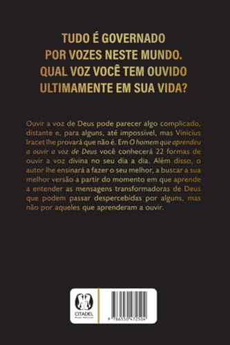 Ouvir a voz de Deus pode parecer algo complicado, distante e, para alguns, até impossível, mas Vinicius Iracet lhe provará que não é. Em O homem que aprendeu a ouvir a voz de Deus você conhecerá 22 formas de ouvir a voz divina no seu dia a dia. Além disso, o autor lhe ensinará a fazer o seu melhor, a buscar a sua melhor versão a partir do momento em que aprende a entender as mensagens transformadoras de Deus, que podem passar despercebidas por alguns, mas não por aqueles que aprenderam a ouvir.