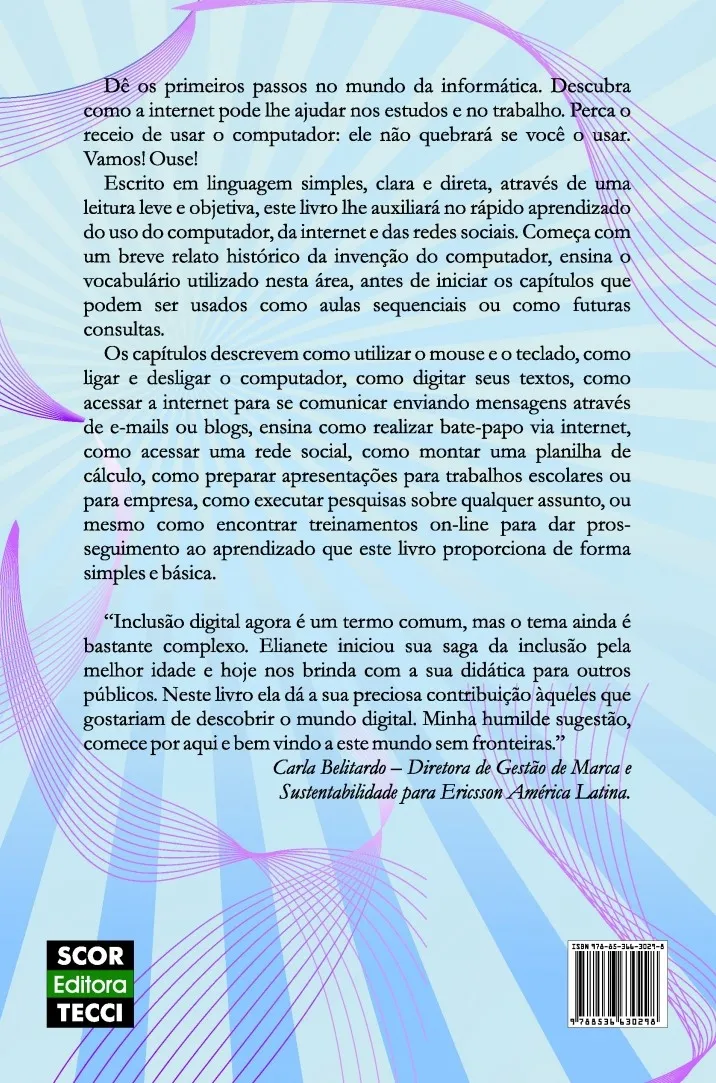 Dê os primeiros passos no mundo da informática. Descubra como a internet pode lhe ajudar nos estudos e no trabalho. Perca o receio de usar o computador: ele não quebrará se você o usar. Vamos! Ouse! Escrito em linguagem simples, clara e direta, através de uma leitura leve e objetiva, este livro lhe auxiliará no rápido aprendizado do uso do computador, da internet e das redes sociais. Começa com um breve relato histórico da invenção do computador, ensina o vocabulário utilizado nesta área, antes de iniciar os capítulos que podem ser usados como aulas sequenciais ou como futuras consultas. Os capítulos descrevem como utilizar o mouse e o teclado, como ligar e desligar o computador, como digitar seus textos, como acessar a internet para se comunicar enviando mensagens através de e-mails ou blogs, ensina como realizar bate-papo via internet, como acessar uma rede social, como montar uma planilha de cálculo, como preparar apresentações para trabalhos escolares ou para empresa, como executar pesquisas sobre qualquer assunto, ou mesmo como encontrar treinamentos on-line para dar prosseguimento ao aprendizado que este livro proporciona de forma simples e básica.