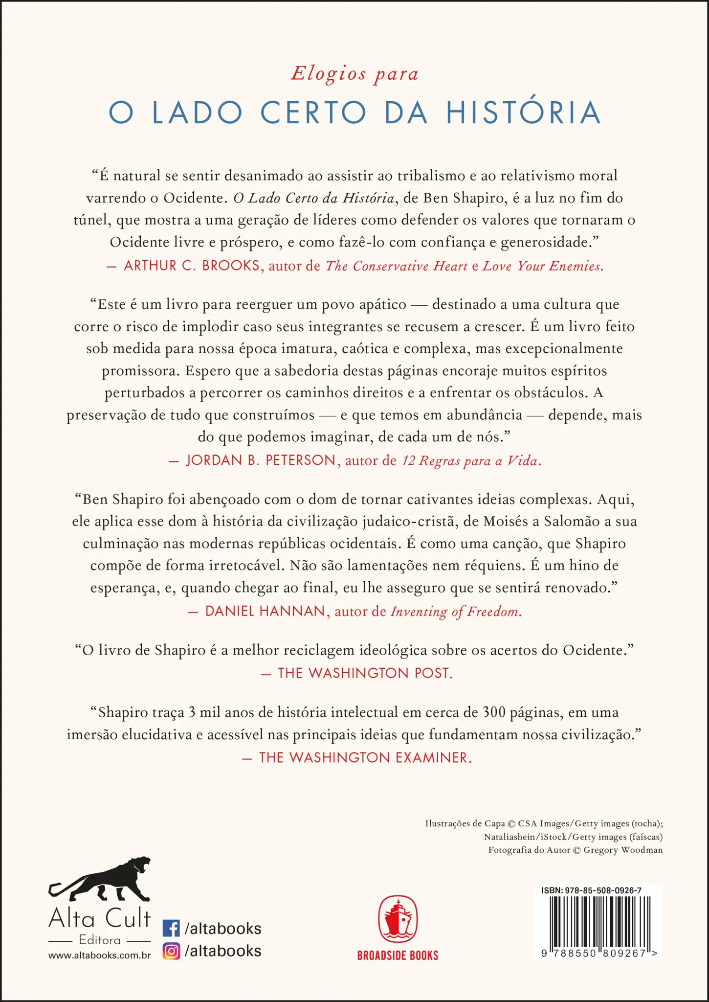 “É natural se sentir desanimado ao assistir ao tribalismo e ao relativismo moral varrendo o Ocidente. O Lado Certo da História, de Ben Shapiro, é a luz no fim do túnel, que mostra a uma geração de líderes como defender os valores que tornaram o Ocidente livre e próspero, e como fazê-lo com confiança e generosidade.” – ARTHUR C. BROOKS, autor de The Conservative Heart e Love Your Enemies.