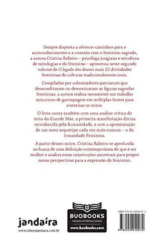 Neste segundo volume, a autora Cristina Balieiro compila mais 22 deusas de culturas tradicionalmente orais, atualizando os mitos para a realidade da mulher contemporânea a partir de um olhar junguiano sempre crítico à realidade imposta pelo patriarcado. Psicóloga junguiana e estudiosa de mitologia, Cristina Balieiro se aprofunda na busca de uma definição atual do que é ser mulher e analisa essas construções ancestrais para propor novas perspectivas para a expressão do feminino. Assim como no primeiro volume, o livro traz as imagens das deusas desenhadas pela própria autora em um baralho com 22 cartas.