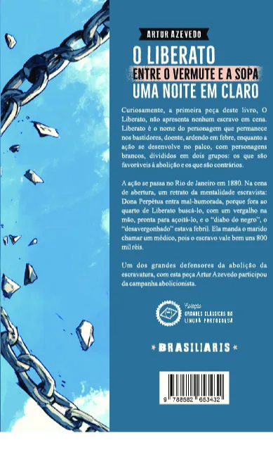 Curiosamente, a primeira peça deste livro, O Liberato, não apresenta nenhum escravo em cena. Liberato é o nome do personagem que permanece nos bastidores, doente, ardendo em febre, enquanto a ação se desenvolve no palco, com personagens brancos, divididos em dois grupos: os que são favoráveis à abolição e os que são contrários. A ação se passa no Rio de Janeiro em 1880. Na cena de abertura, um retrato da mentalidade escravista: Dona Perpétua entra mal-humorada, porque fora ao quarto de Liberato buscá-lo, com um vergalho na mão, pronta para açoitá-lo, e o “diabo do negro”, o “desavergonhado” estava febril. Ela manda o marido chamar um médico, pois o escravo vale bem uns 800 mil réis.