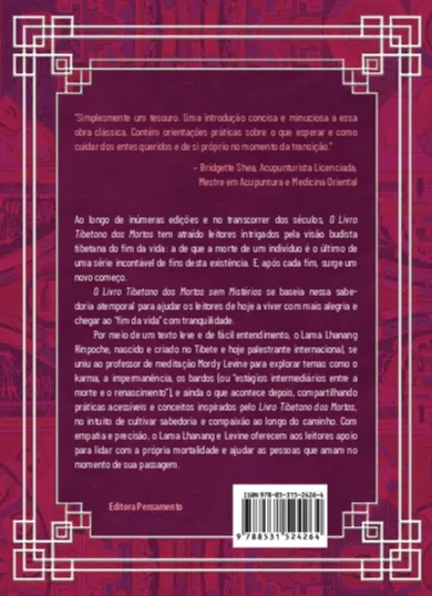 Com uma linguagem acessível, Lama Lhanang Rinpoche, nascido no Tibete e palestrante internacional, e o professor de meditação Mordy Levine exploram temas como karma, impermanência, os bardos (estágios entre morte e renascimento) e o além-vida. Eles compartilham práticas e conceitos do “Livro Tibetano dos Mortos” para cultivar sabedoria e compaixão, oferecendo apoio para enfrentar a mortalidade e amparar entes queridos na passagem.