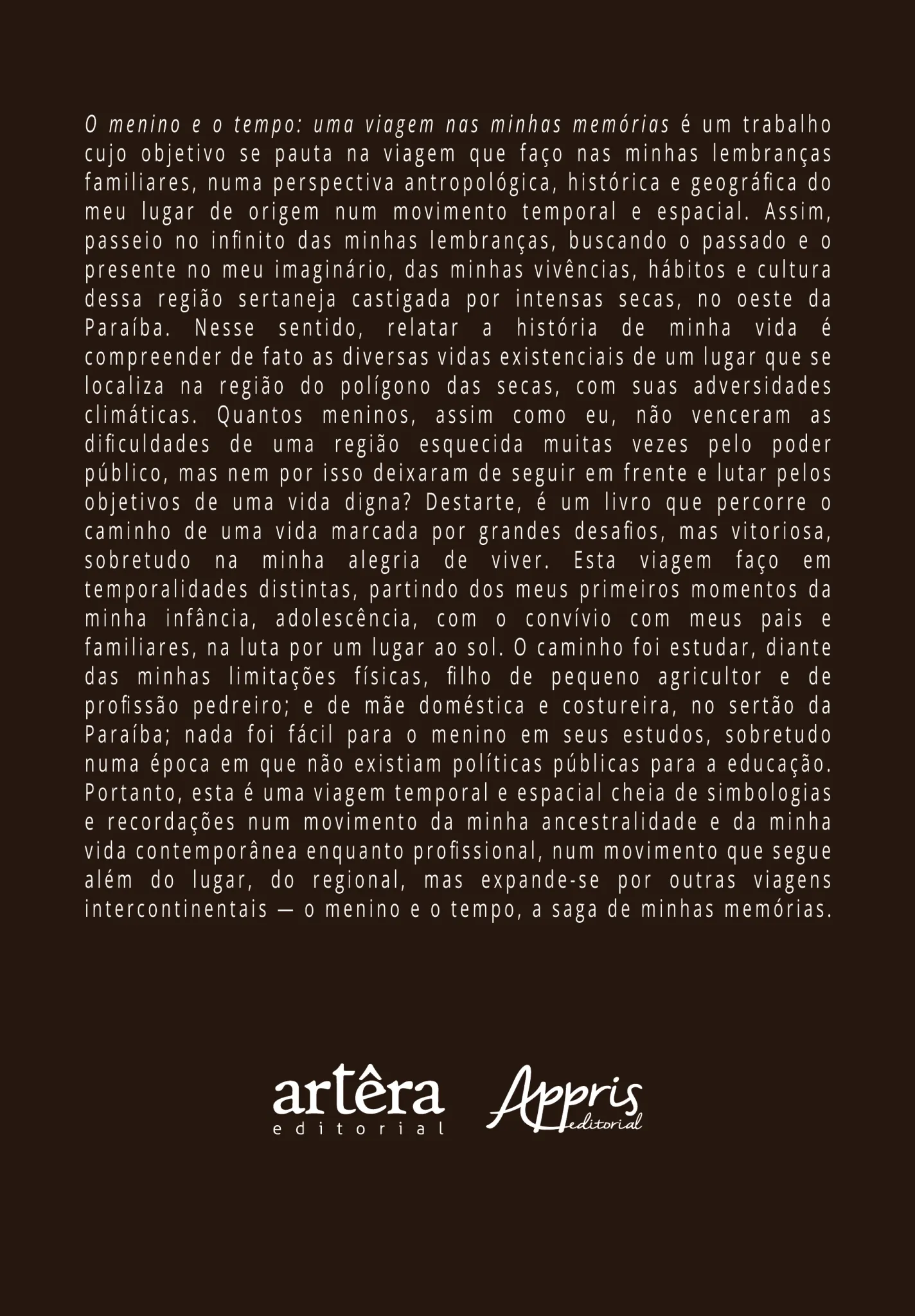 O menino e o tempo: uma viagem nas minhas memórias é um trabalho cujo objetivo se pauta na viagem que faço nas minhas lembranças familiares, numa perspectiva antropológica, histórica e geográfica do meu lugar de origem num movimento temporal e espacial. Assim, passeio no infinito das minhas lembranças, buscando o passado e o presente no meu imaginário, das minhas vivências, hábitos e cultura dessa região sertaneja castigada por intensas secas, no oeste da Paraíba. Nesse sentido, relatar a história de minha vida é compreender de fato as diversas vidas existenciais de um lugar que se localiza na região do polígono das secas, com suas adversidades climáticas. Quantos meninos, assim como eu, não venceram as dificuldades de uma região esquecida muitas vezes pelo poder público, mas nem por isso deixaram de seguir em frente e lutar pelos objetivos de uma vida digna? Destarte, é um livro que percorre o caminho de uma vida marcada por grandes desafios, mas vitoriosa, sobretudo na minha alegria de viver. Esta viagem faço em temporalidades distintas, partindo dos meus primeiros momentos da minha infância, adolescência, com o convívio com meus pais e familiares, na luta por um lugar ao sol. O caminho foi estudar, diante das minhas limitações físicas, filho de pequeno agricultor e de profissão pedreiro; e de mãe doméstica e costureira, no sertão da Paraíba; nada foi fácil para o menino em seus estudos, sobretudo numa época em que não existiam políticas públicas para a educação. Portanto, esta é uma viagem temporal e espacial cheia de simbologias e recordações num movimento da minha ancestralidade e da minha vida contemporânea enquanto profissional, num movimento que segue além do lugar, do regional, mas expande-se por outras viagens intercontinentais — o menino e o tempo, a saga de minhas memórias.