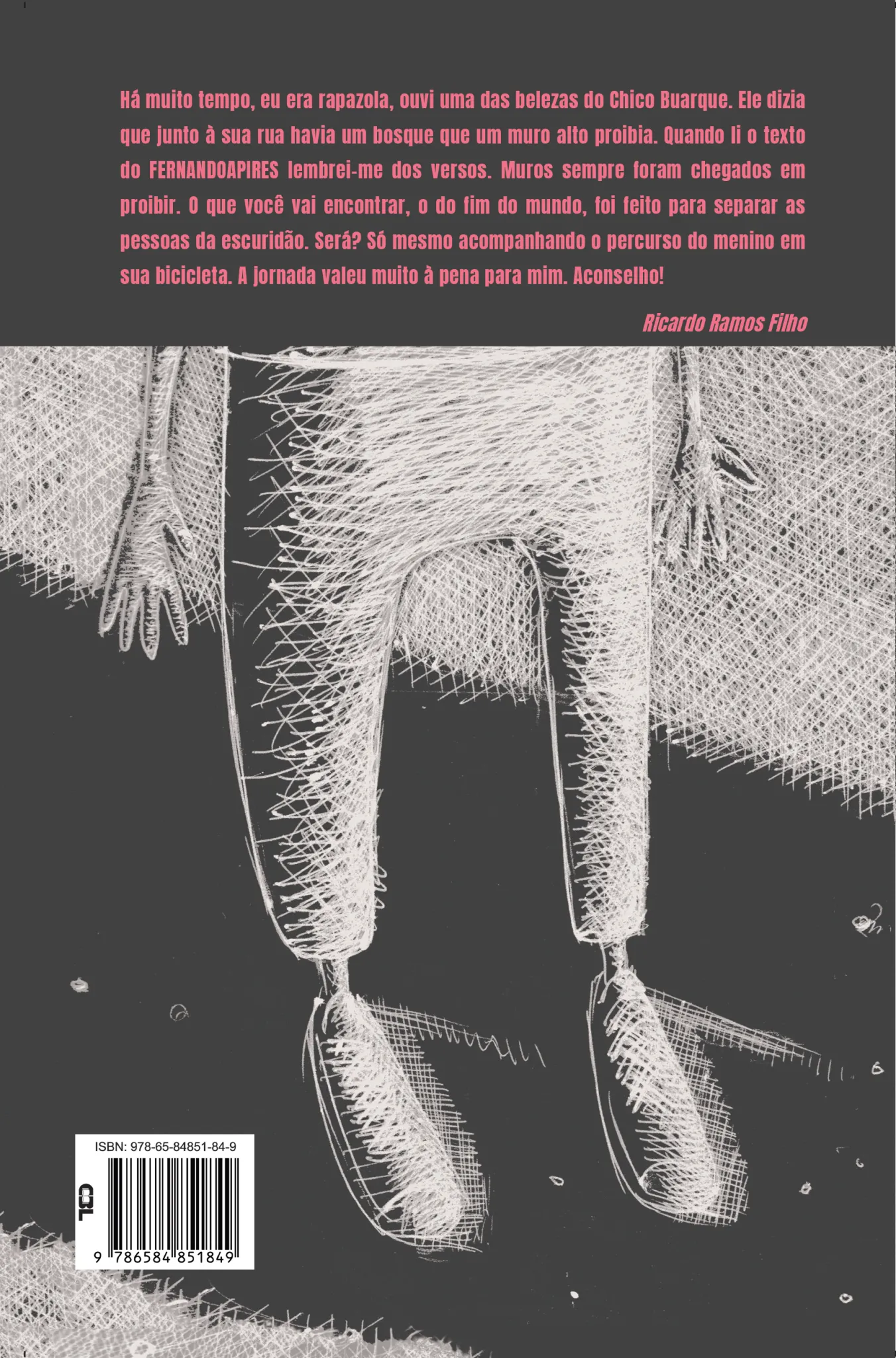 FERNANDOAPIRES constrói uma obra cuja linguagem constrói passagens que impressionam pela densidade de significado. O espaço físico do muro, muito longe da obviedade, tangencia limiares: questões emocionais, existenciais e sociais põem-se no horizonte. O texto permanece ecoando na mente do leitor, mesmo depois da última palavra. Impressiona-nos a forma lúdica encontrada pelo autor para abordar temas complexos, por meio de uma linguagem que propicia à criança, ao jovem (e o adulto) pensar o mundo. Tem-se, por certo, uma construção lúdica, lúcida, sensível e deveras poética.
