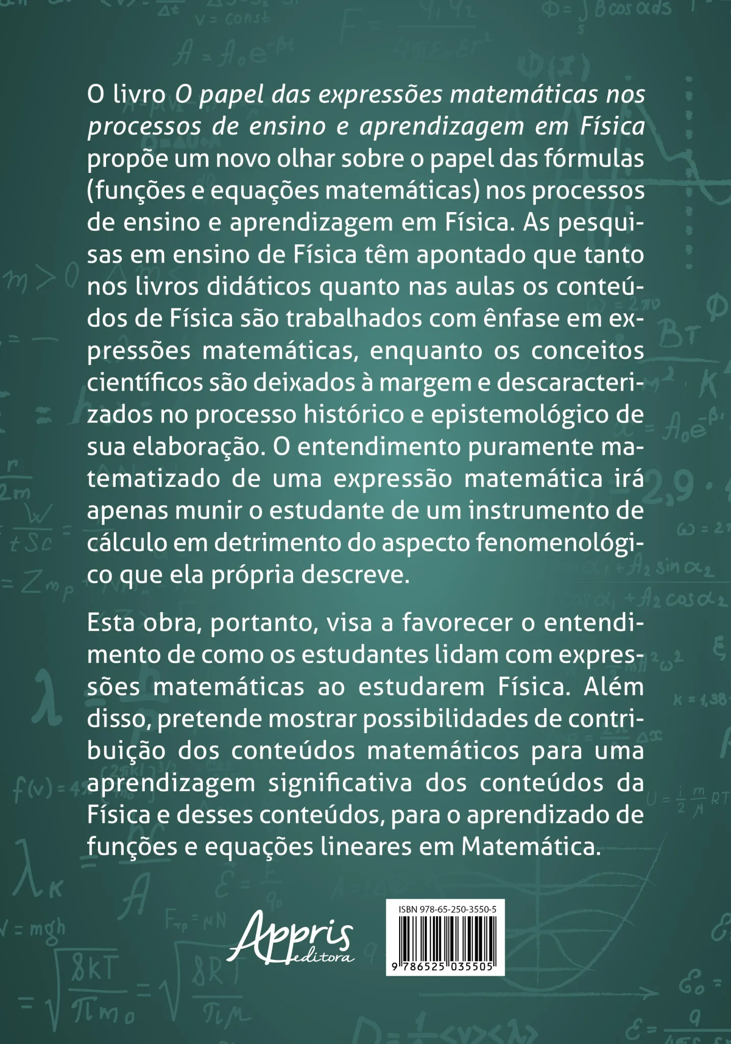 O livro O papel das expressões matemáticas nos processos de ensino e aprendizagem em Física propõe um novo olhar sobre o papel das fórmulas (funções e equações matemáticas) nos processos de ensino e aprendizagem em Física. As pesquisas em ensino de Física têm apontado que tanto nos livros didáticos quanto nas aulas os conteúdos de Física são trabalhados com ênfase em expressões matemáticas, enquanto os conceitos científicos são deixados à margem e descaracterizados no processo histórico e epistemológico de sua elaboração. O entendimento puramente matematizado de uma expressão matemática irá apenas munir o estudante de um instrumento de cálculo em detrimento do aspecto fenomenológico que ela própria descreve. Esta obra, portanto, visa a favorecer o entendimento de como os estudantes lidam com expressões matemáticas ao estudarem Física. Além disso, pretende mostrar possibilidades de contribuição dos conteúdos matemáticos para uma aprendizagem significativa dos conteúdos da Física e desses conteúdos, para o aprendizado de funções e equações lineares em Matemática.