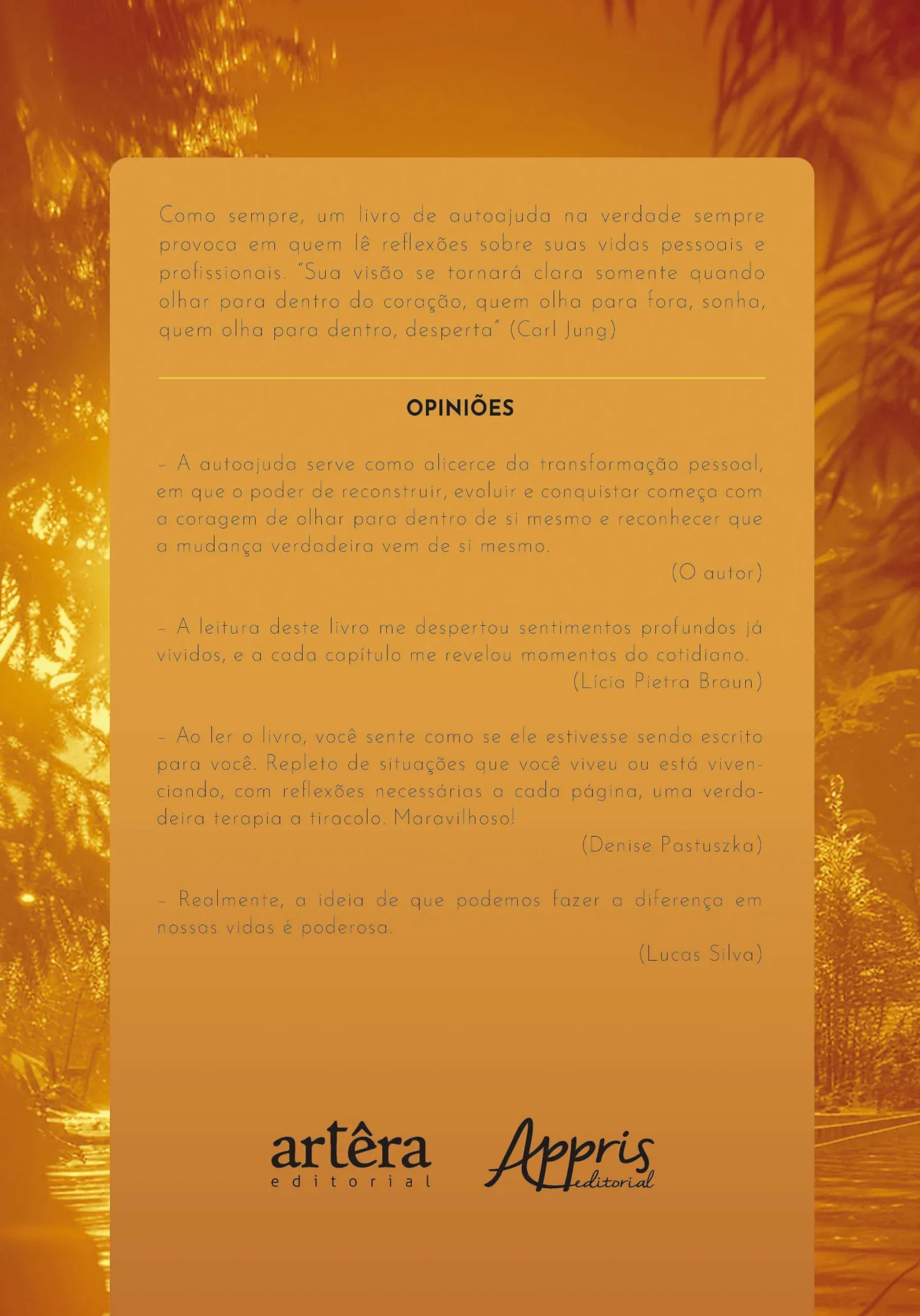 Como sempre, um livro de autoajuda na verdade sempre provoca em quem lê reflexões sobre suas vidas pessoais e profissionais. “Sua visão se tornará clara somente quando olhar para dentro do coração, quem olha para fora, sonha, quem olha para dentro, desperta” (Carl Jung).